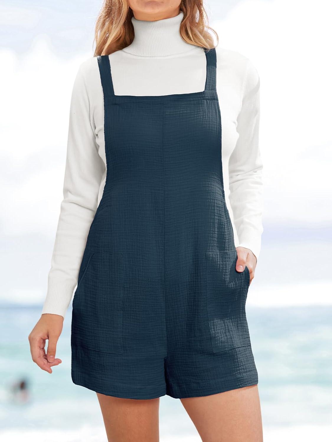 CUPSHE Casual Cotton Loose Rompers Fit Summer Pockets Sleeveless Wide Strap Square Neck Outfit(Navy Blue)