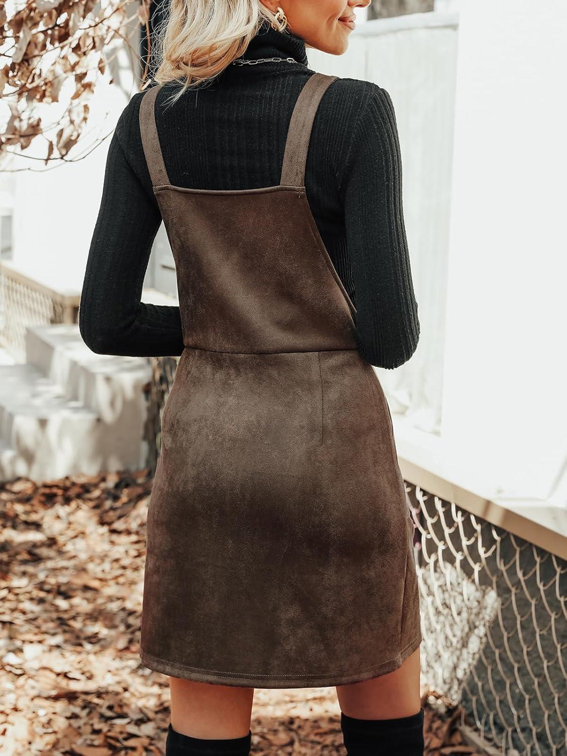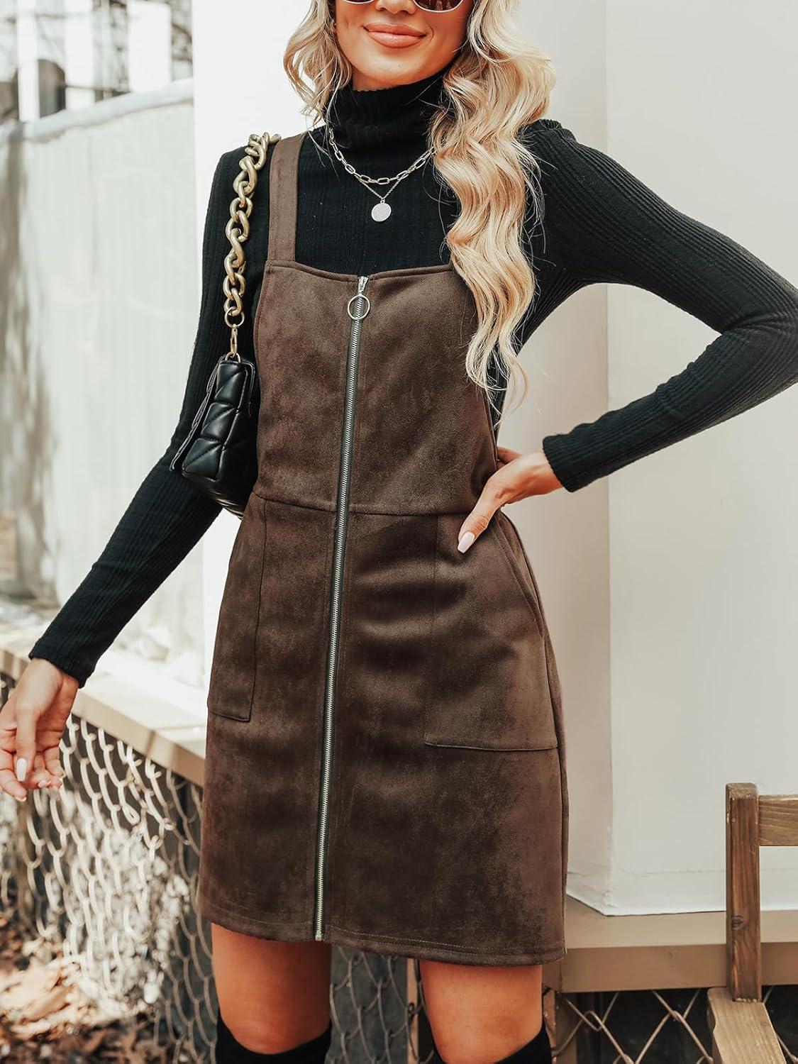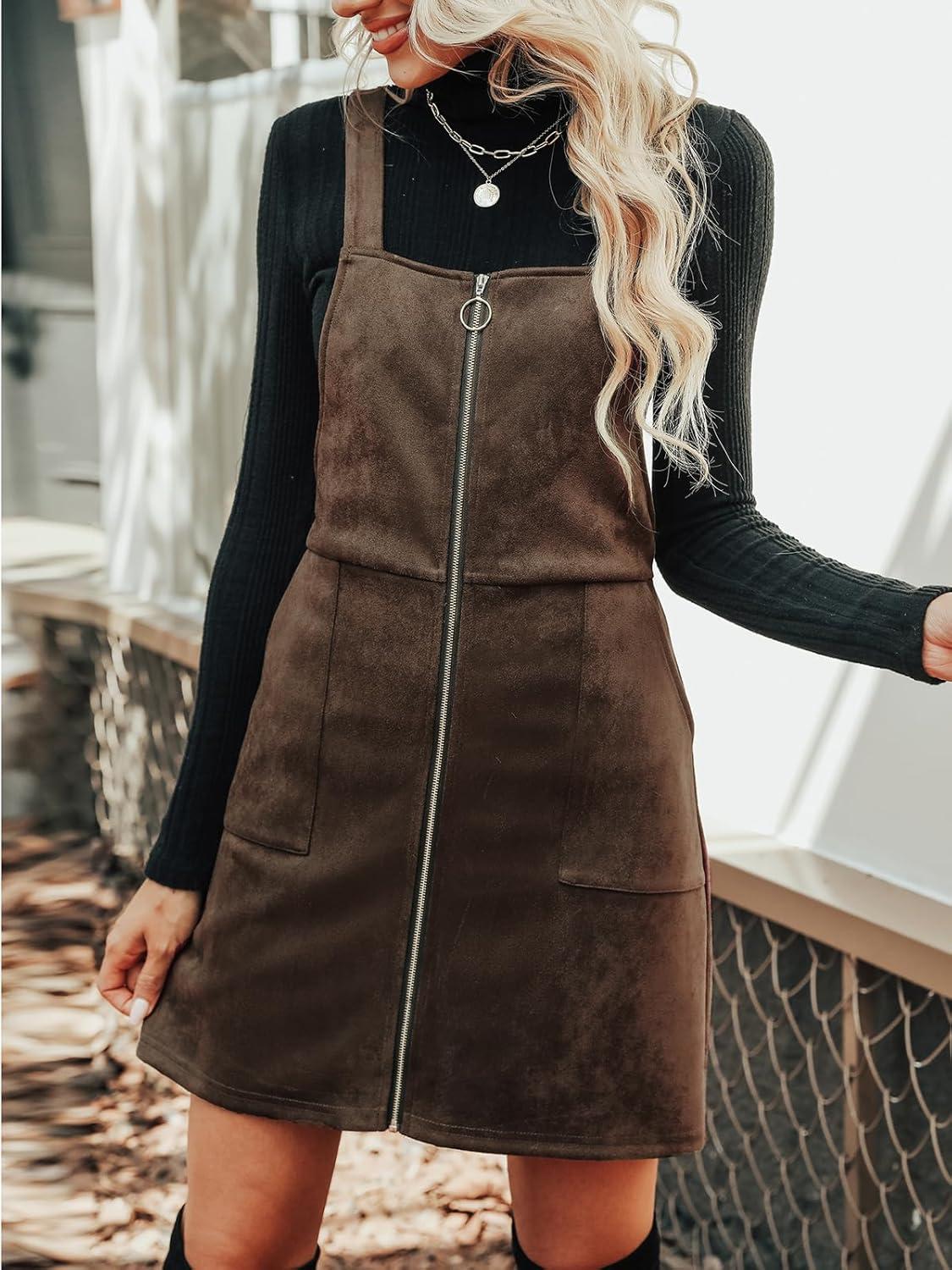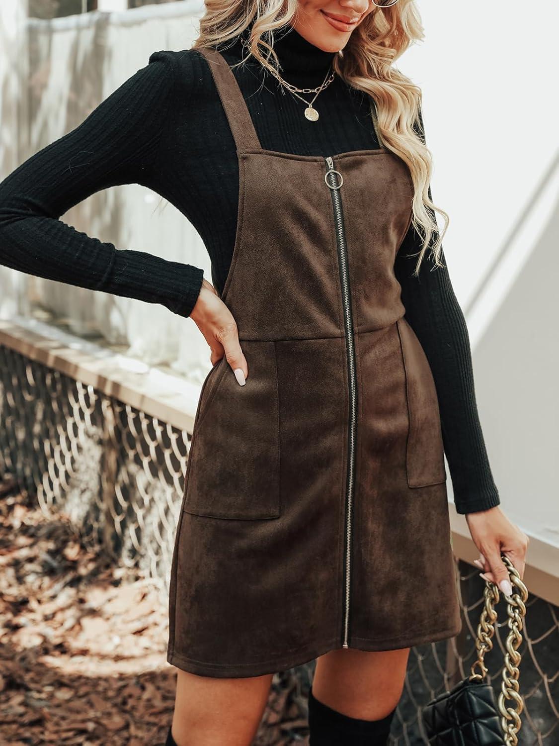 CUPSHE Faux Suede Mini Fall Dresses for Women Square Neck Pull Ring Zipper Front Pockets Wide Straps Casual Autumn Dress(Coffee)