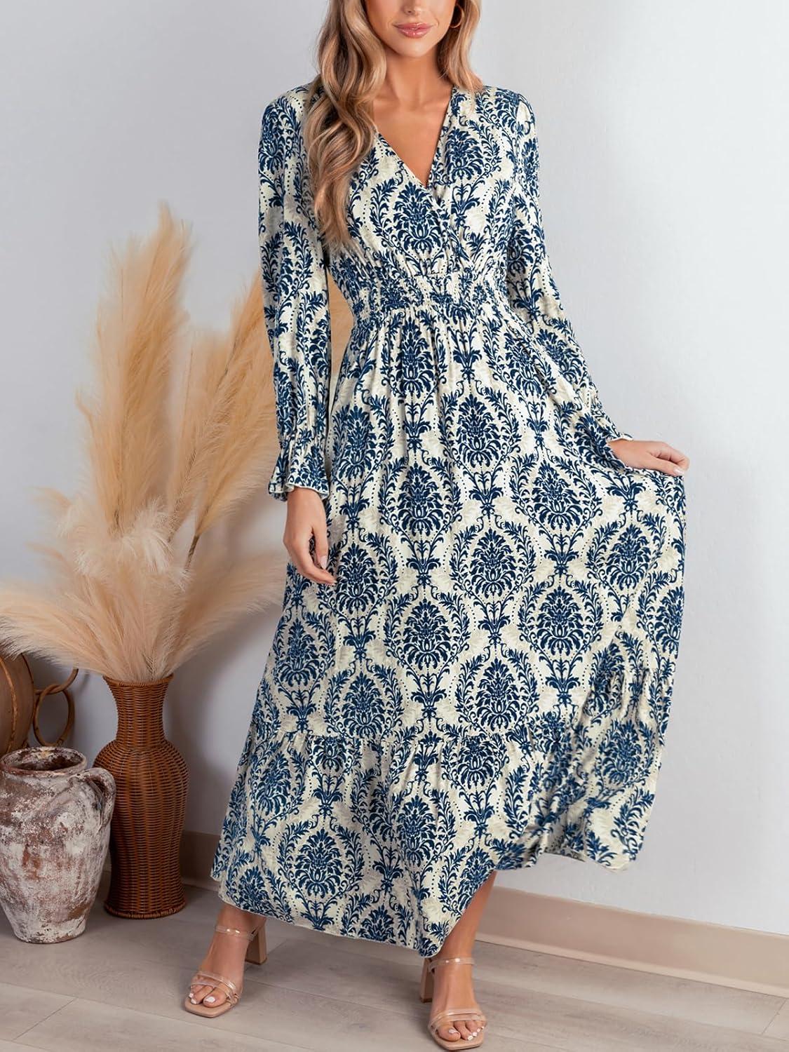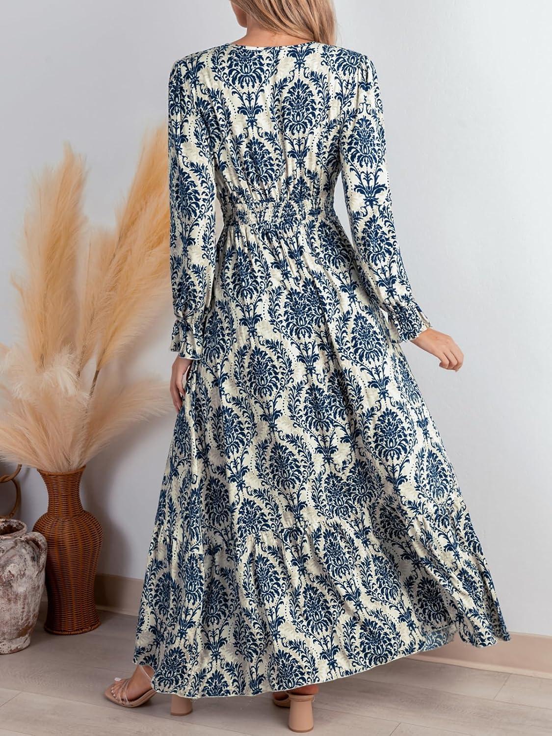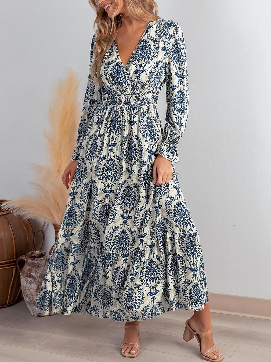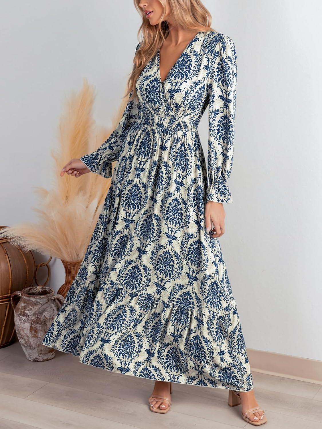 CUPSHE Maxi Dresses for Women V Neck Ruffled Long Sleeve Paisley Smocked Waist A Line Casual Flowy Fall Wedding Guest Dress(Navy Floral)