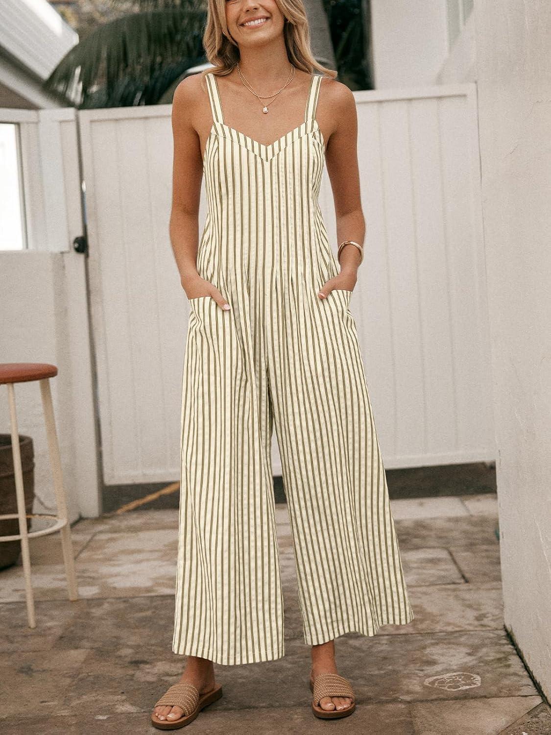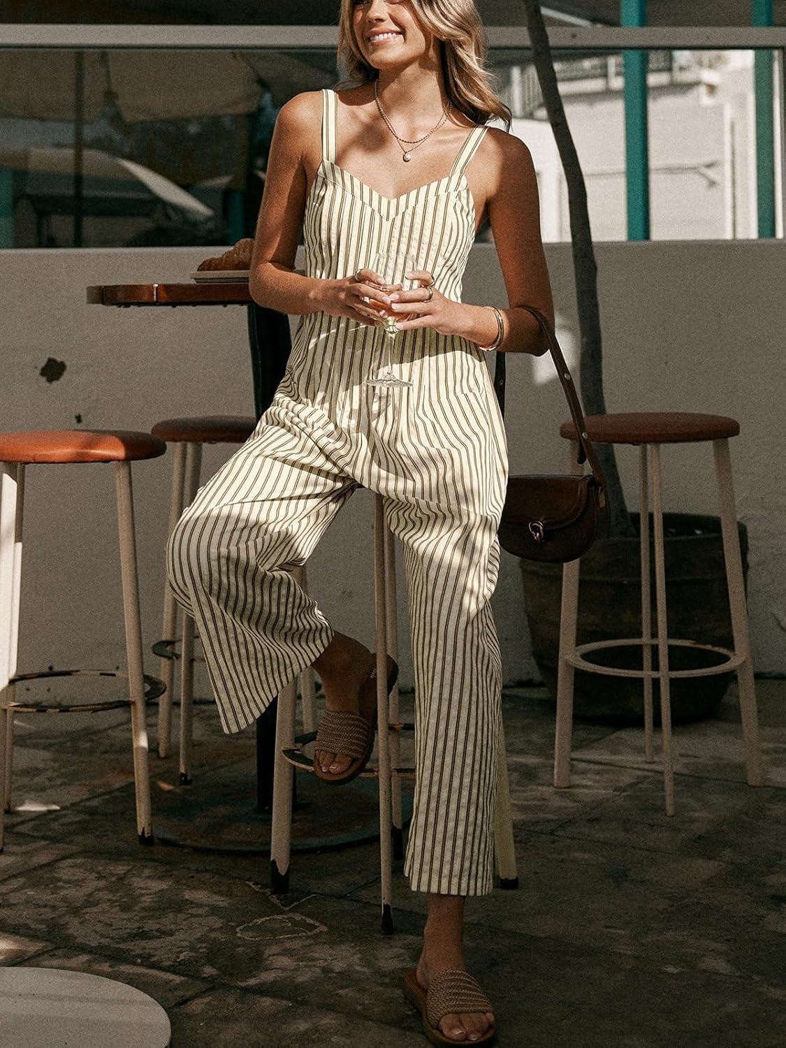 CUPSHE Maxi Jumpsuit for Women Striped Sleeveless Smocked Cutout Back Wide Leg Summer Casual Overall Romper(Green Striped)