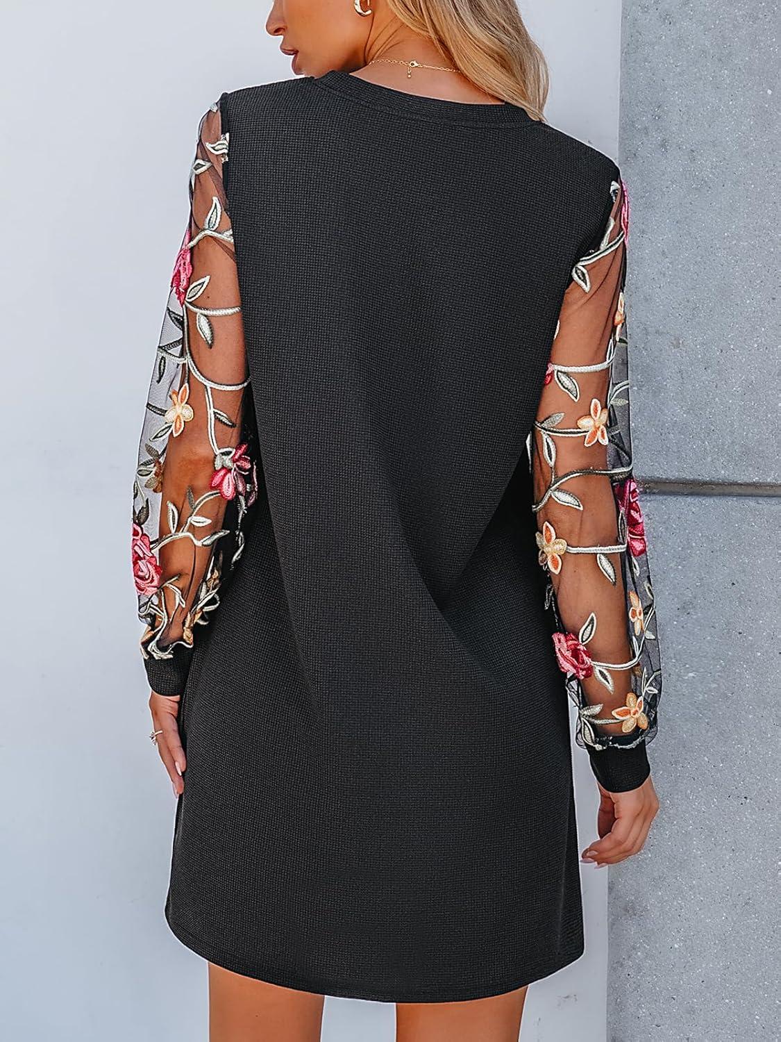 CUPSHE Mini Dresses for Women Round Neck Sheer Long Sleeve Floral Knit A Line Fall Casual Dress(Black)