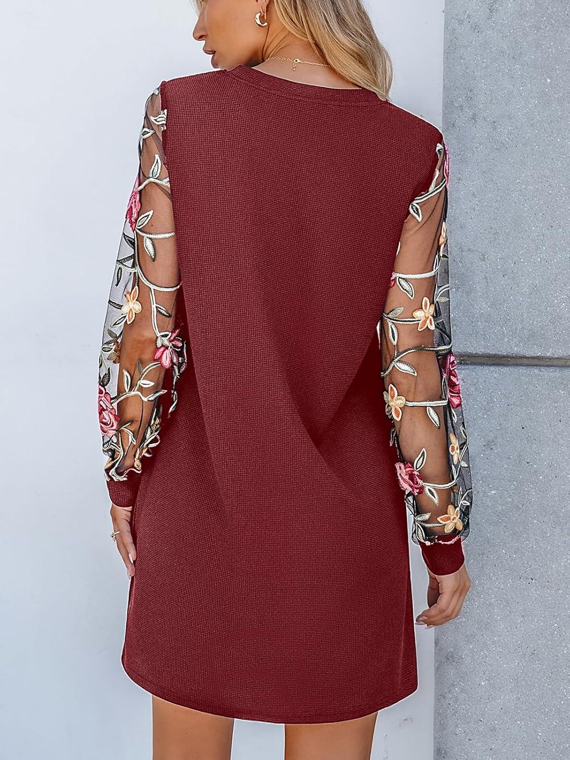 CUPSHE Mini Dresses for Women Round Neck Sheer Long Sleeve Floral Knit A Line Fall Casual Dress(Burgundy)