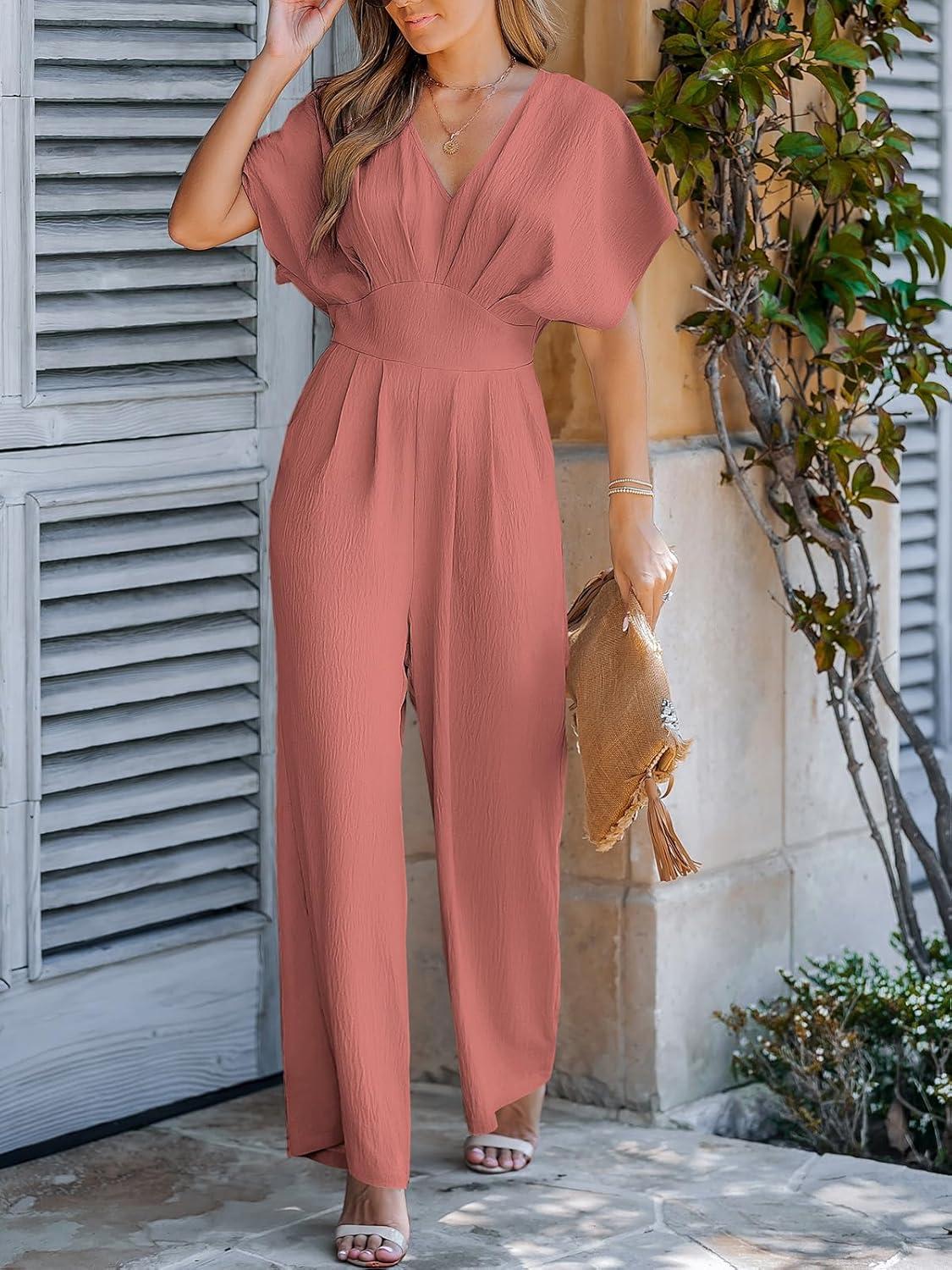 CUPSHE One Piece Jumpsuits for Women Casual Summer V Neck Batwing Sleeve Wide Leg Elegant Overalls Sexy Vacation Outfits(Rose Red)