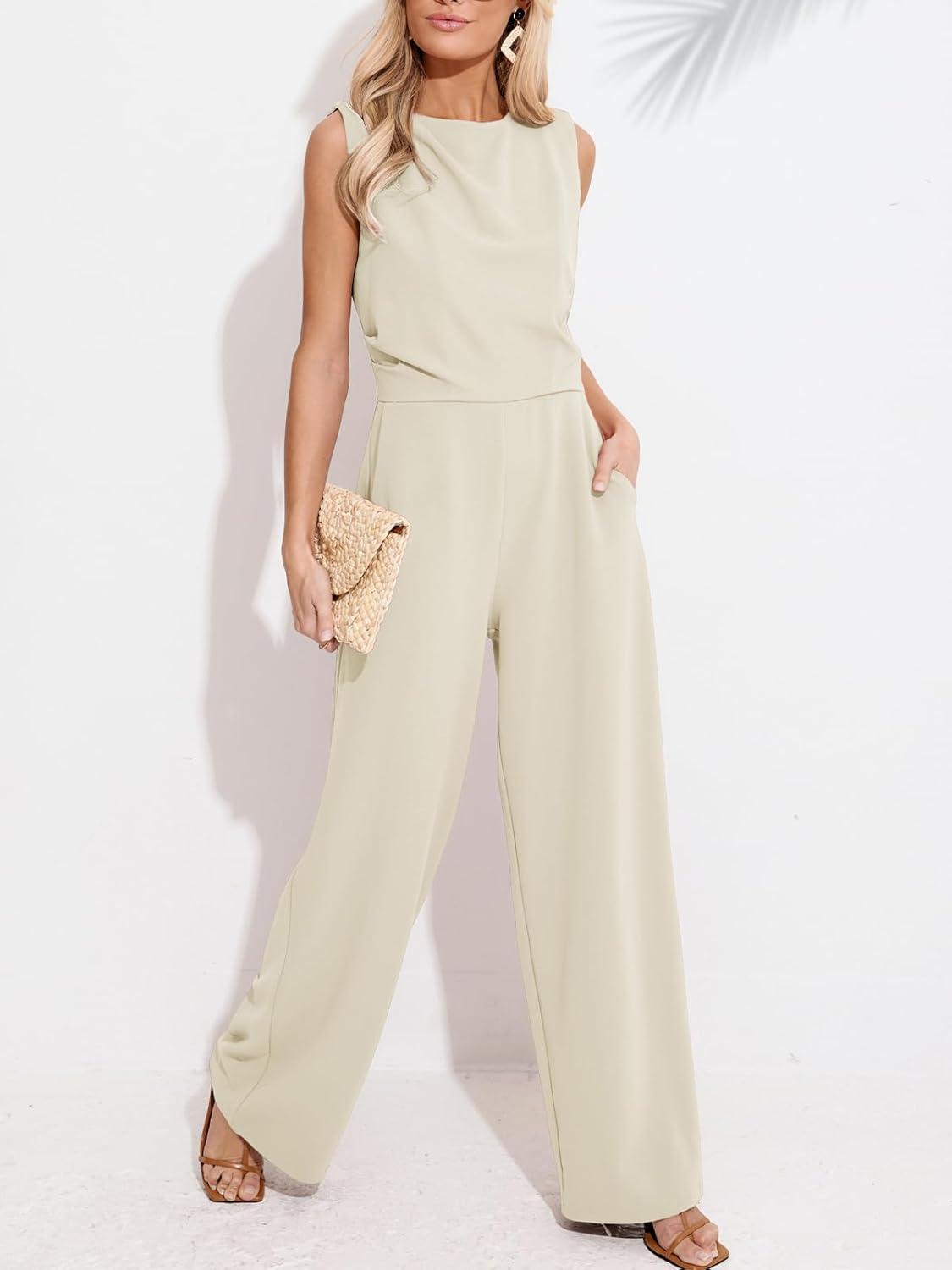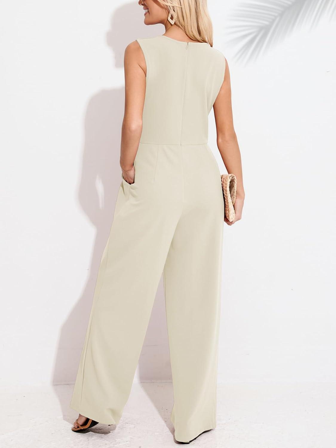 CUPSHE Summer Maxi Jumpsuit Round Neck Sleeveless Wide Leg One Piece Fall Outfit Pockets Fitted Overall Casual Maxi Romper(Apricot)