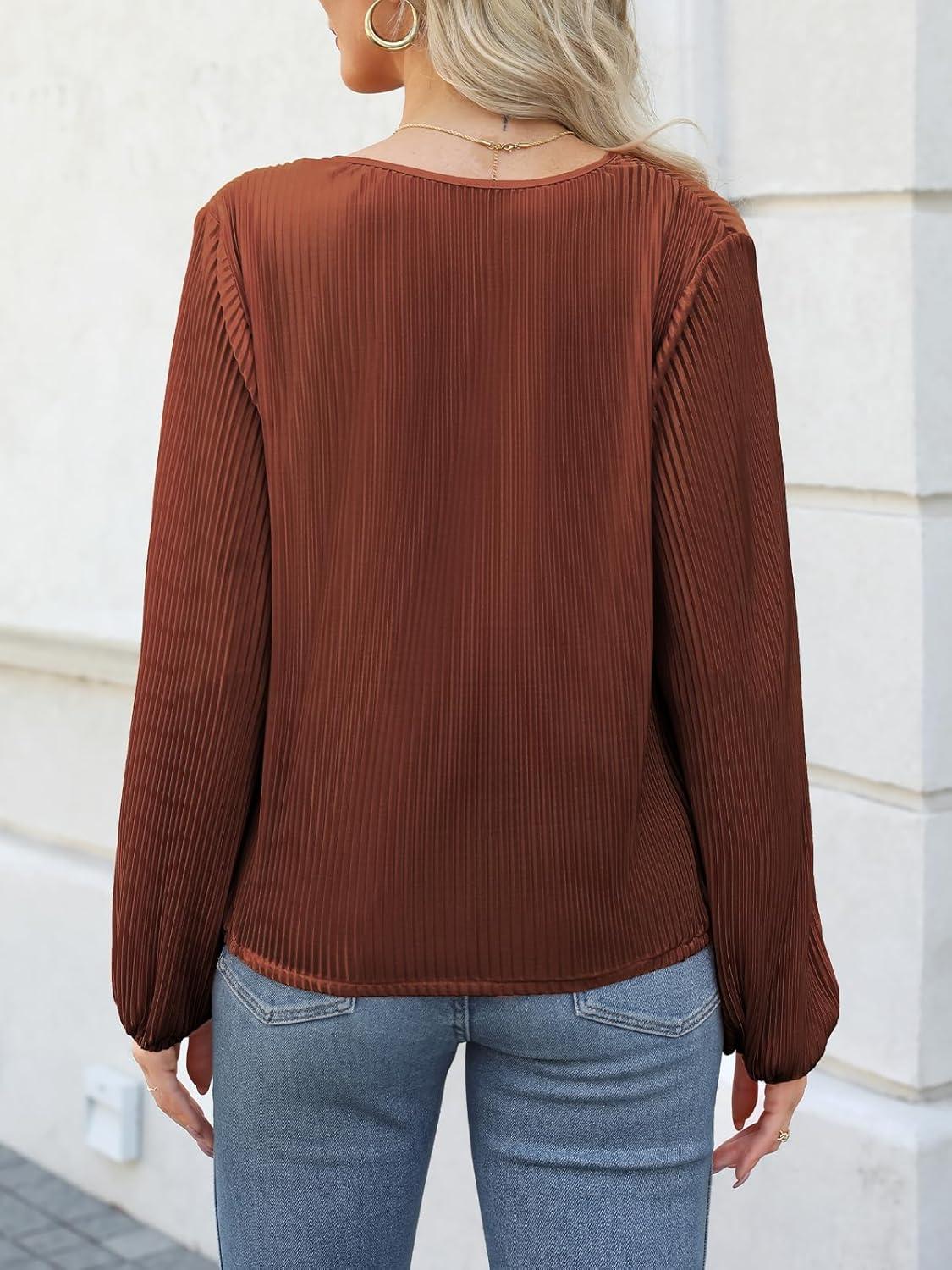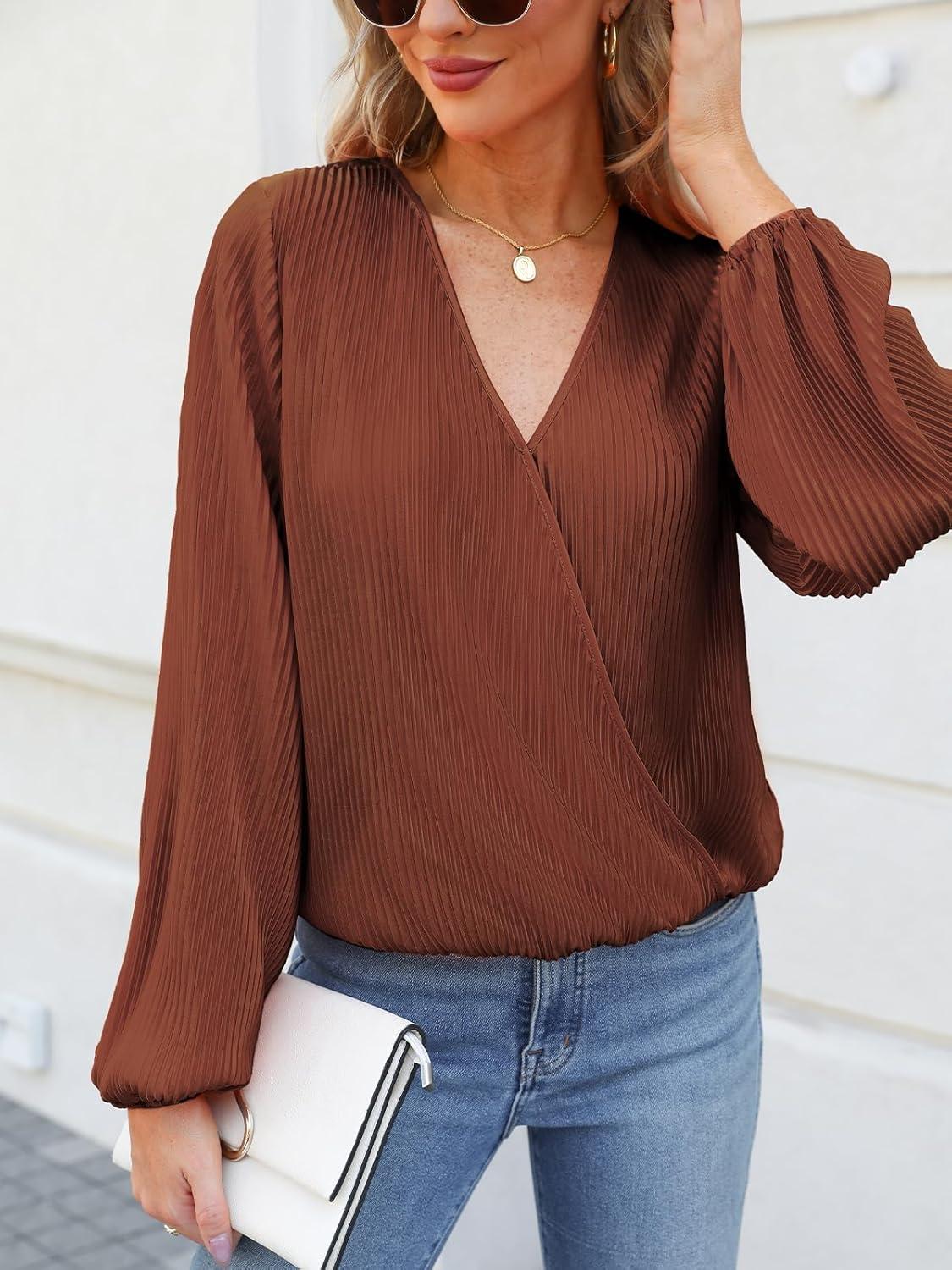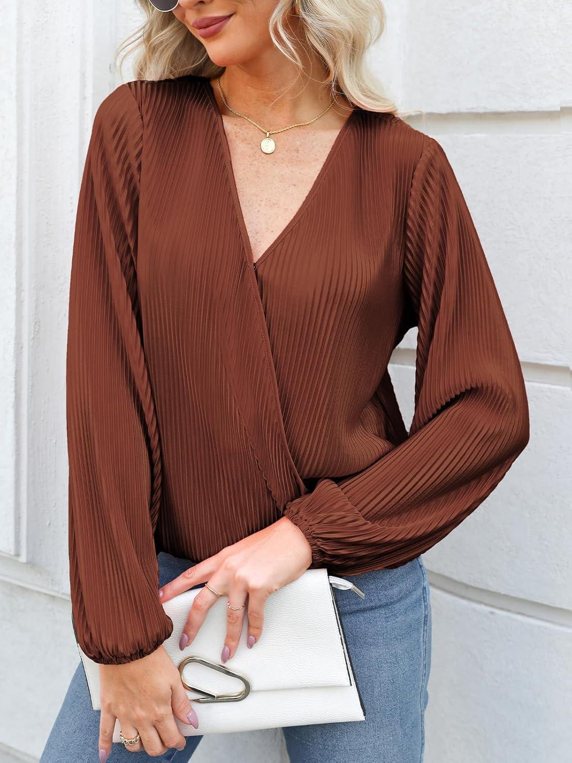 CUPSHE V Neck Wrap Velvet Tops Dressy Causal Long Sleeve Business Work Blouses Loose Fit Shirts Vacation Outfits(Brown)