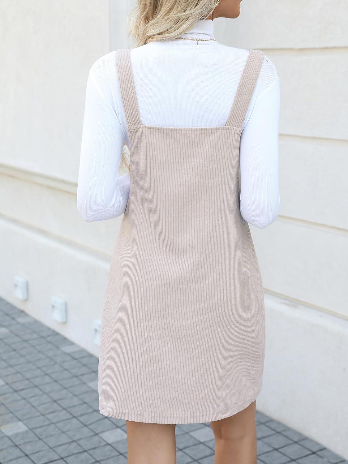 CUPSHE Women Corduroy Fall Dresses Front Bib Pocket Square Neck Wide Strap Casual Overall Mini Dress(Apricot)
