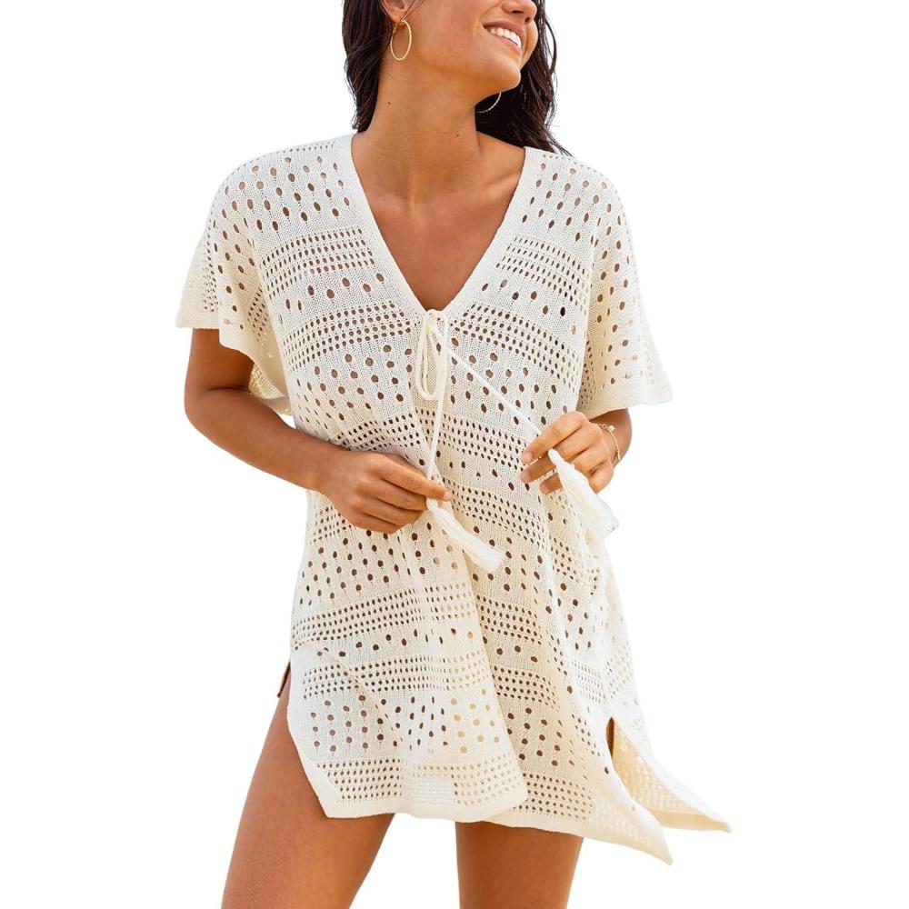 CUPSHE Women Crochet Beach Cover Ups Summer V Neck Casual Mini Coverup Dress Short Sleeve Split Hem Bathing Suit Cover Up(Off-white)