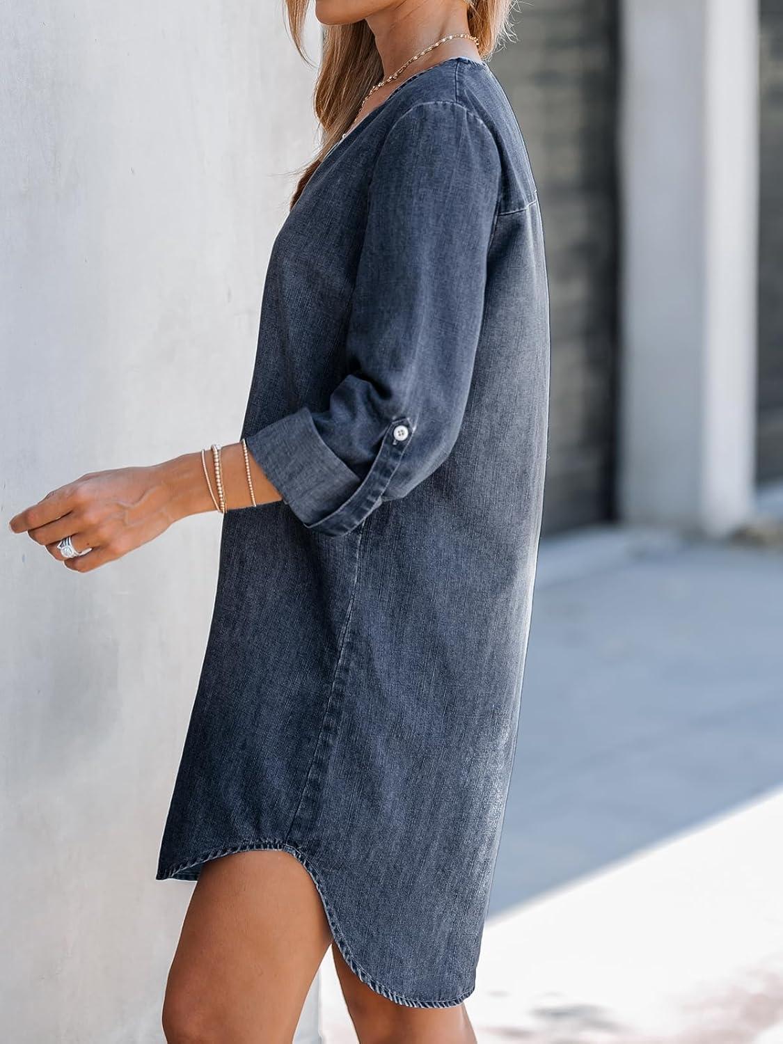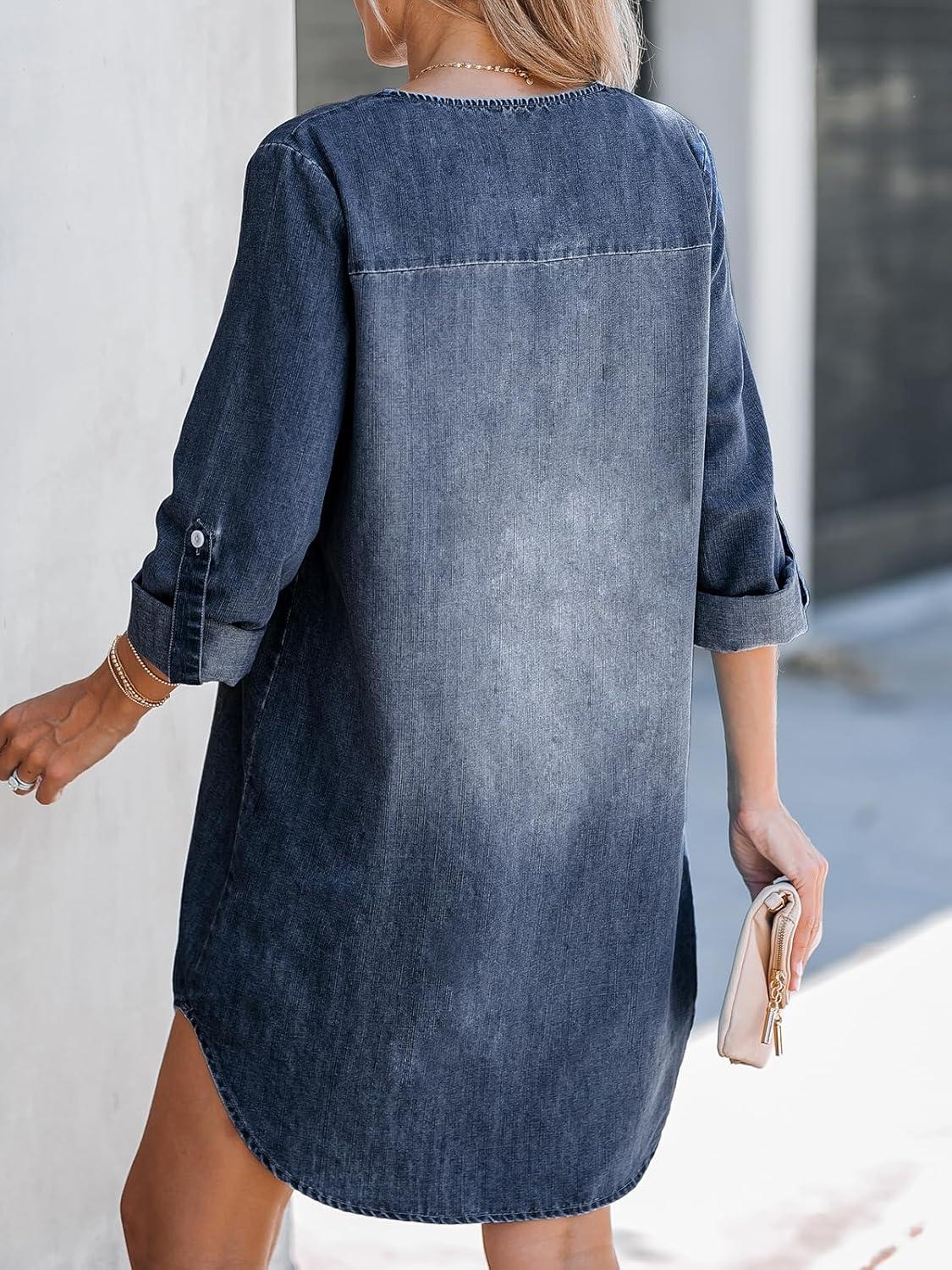 CUPSHE Women Fall Denim Shirt Dresses Cotton Long Sleeve V Neck Distressed Roll Tab Jean Mini Dress(Denim Blue)