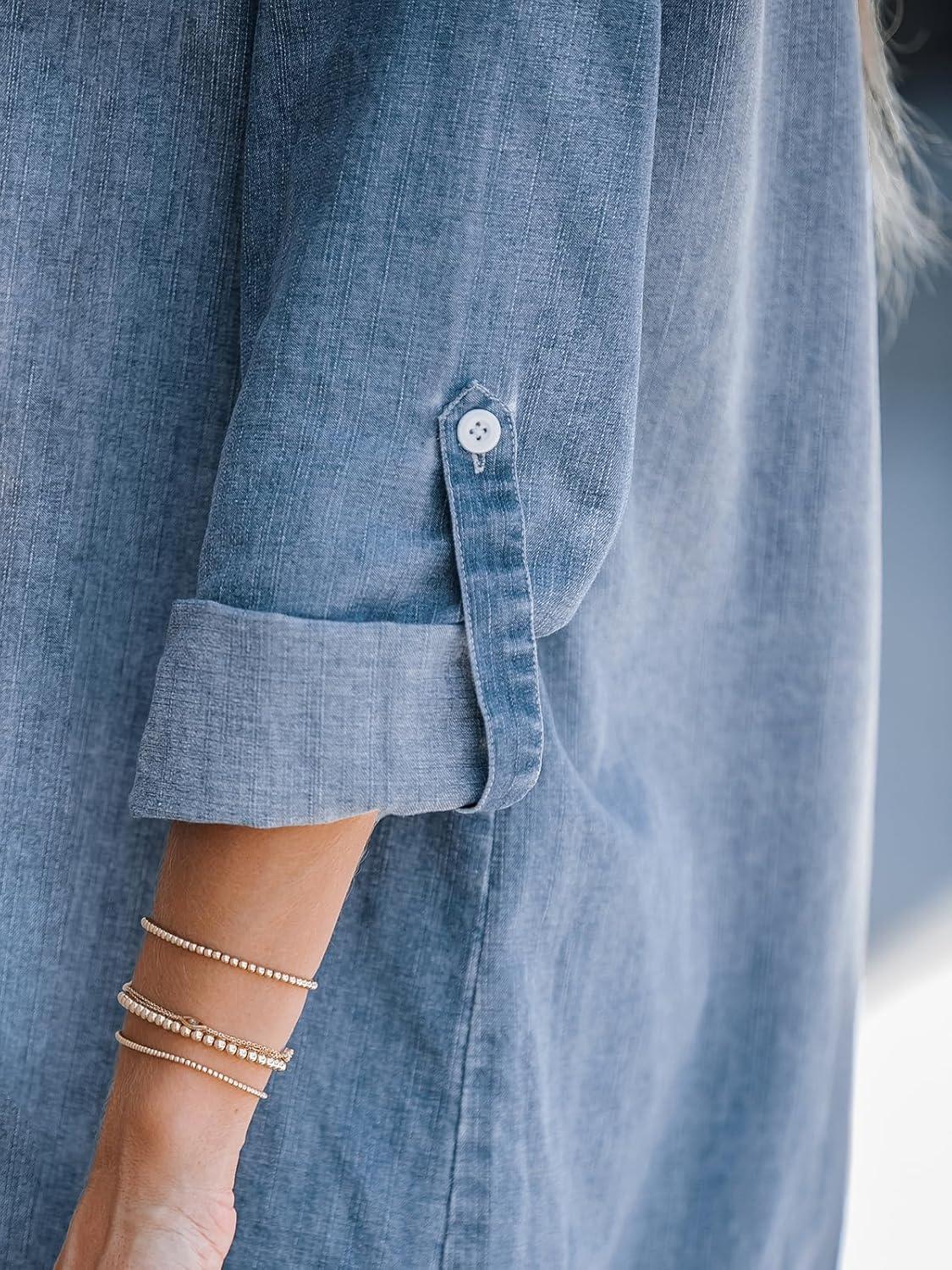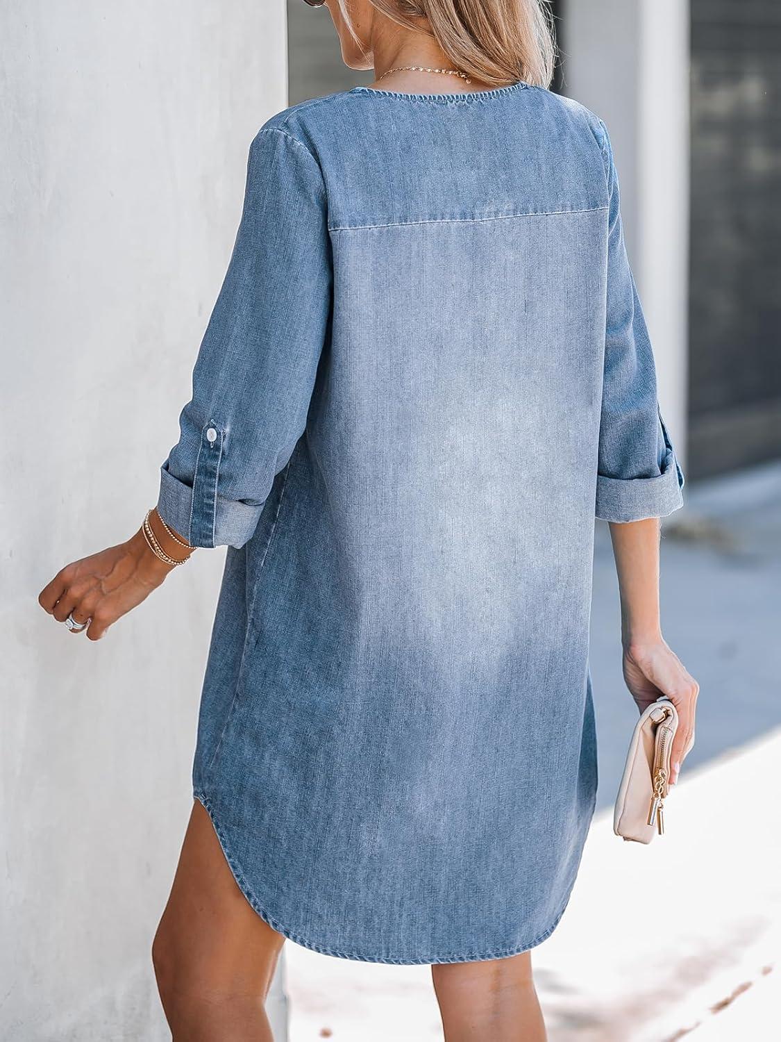 CUPSHE Women Fall Denim Shirt Dresses Cotton Long Sleeve V Neck Distressed Roll Tab Jean Mini Dress(Denim Blue)