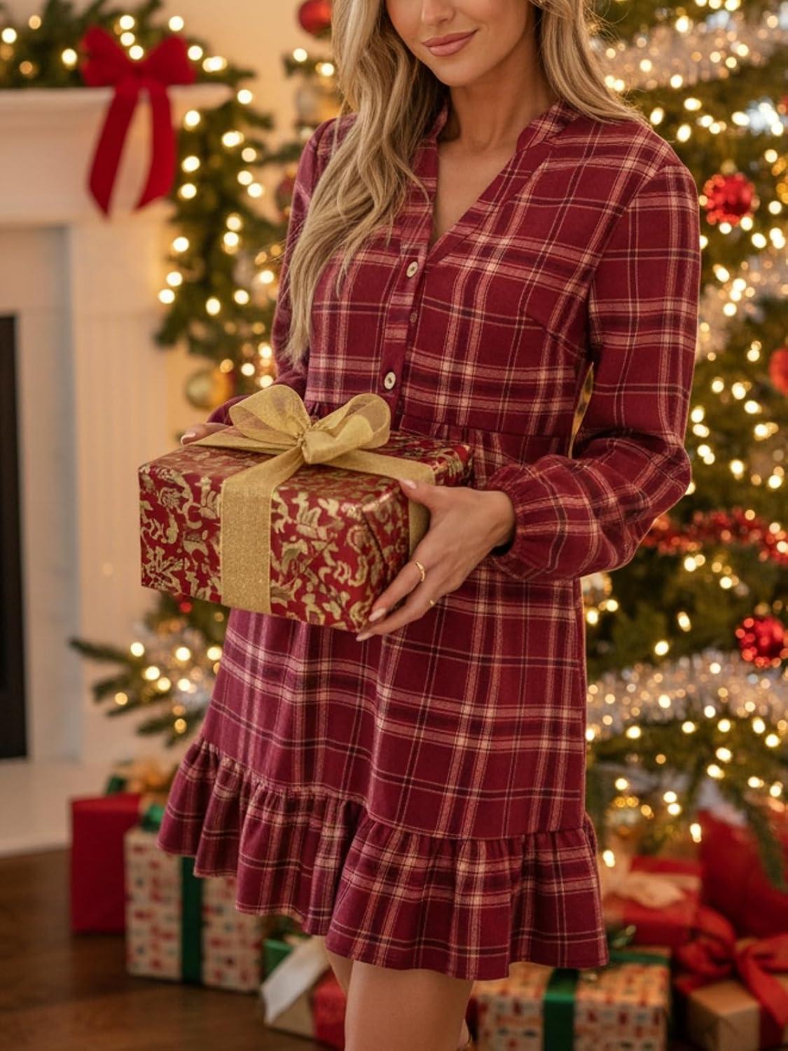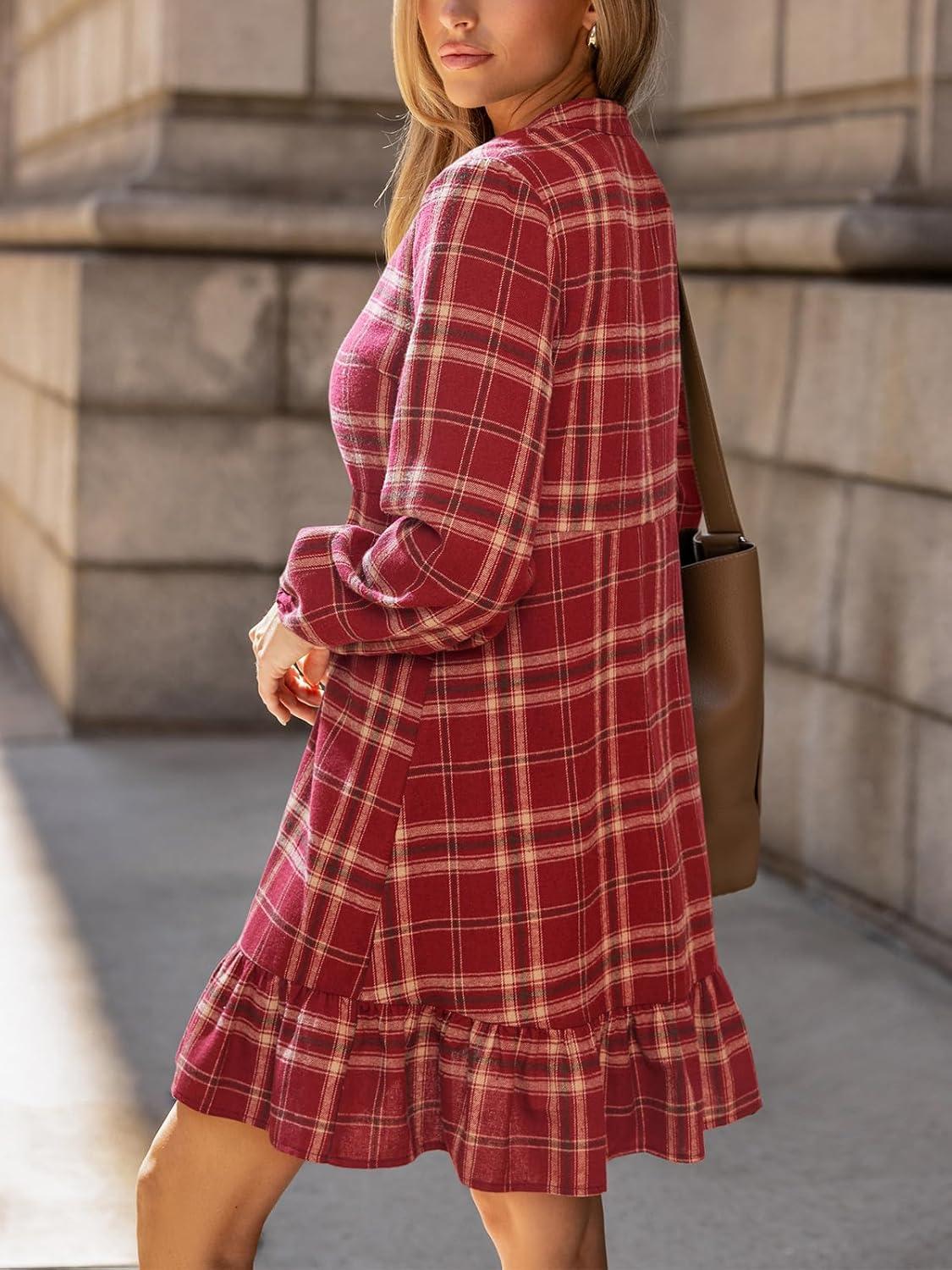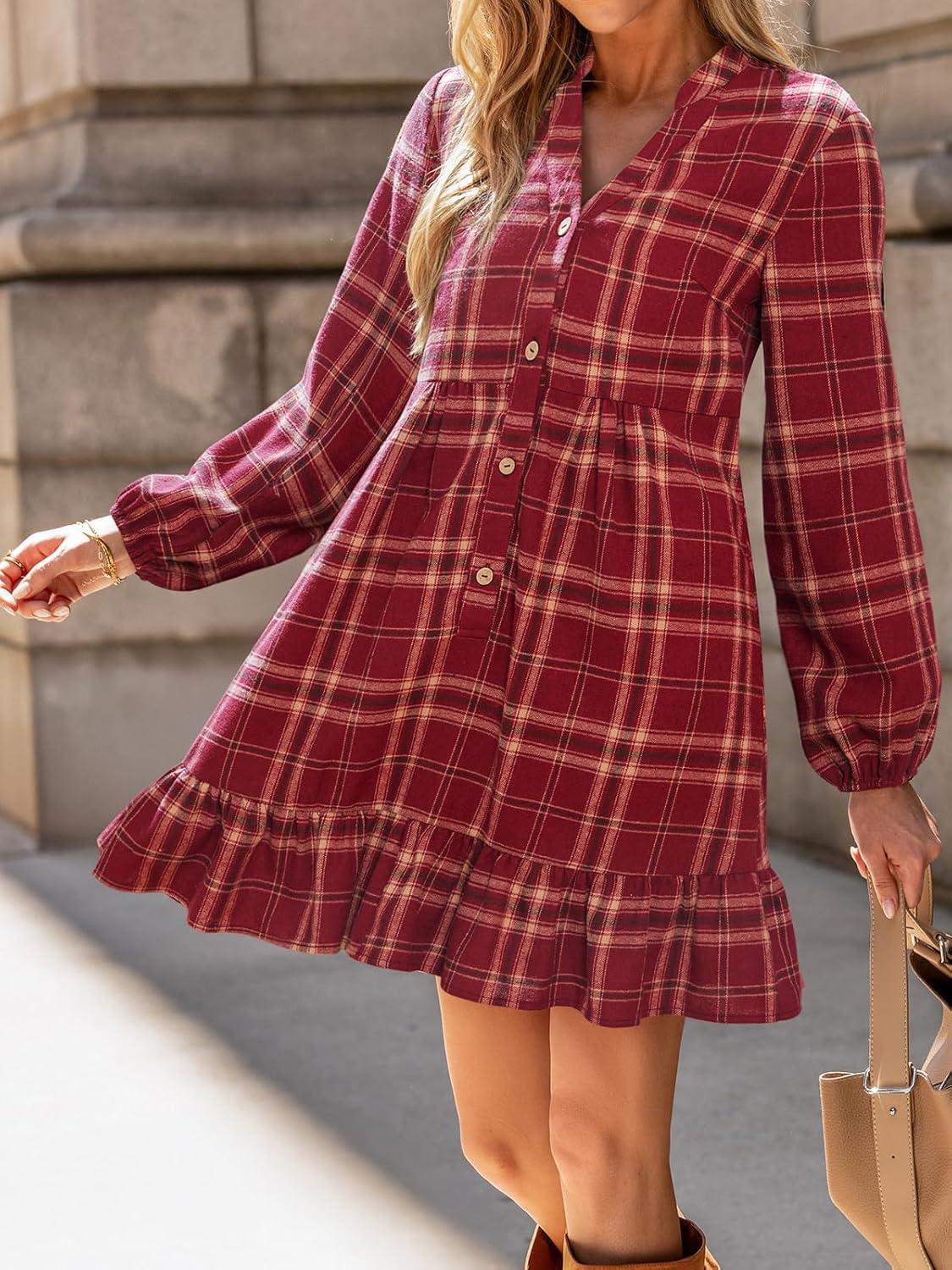 CUPSHE Women Fall Dresses Plaid Ruffle Hem V Neck Long Sleeve Button Holiday Tunic Mini Dress(Red)