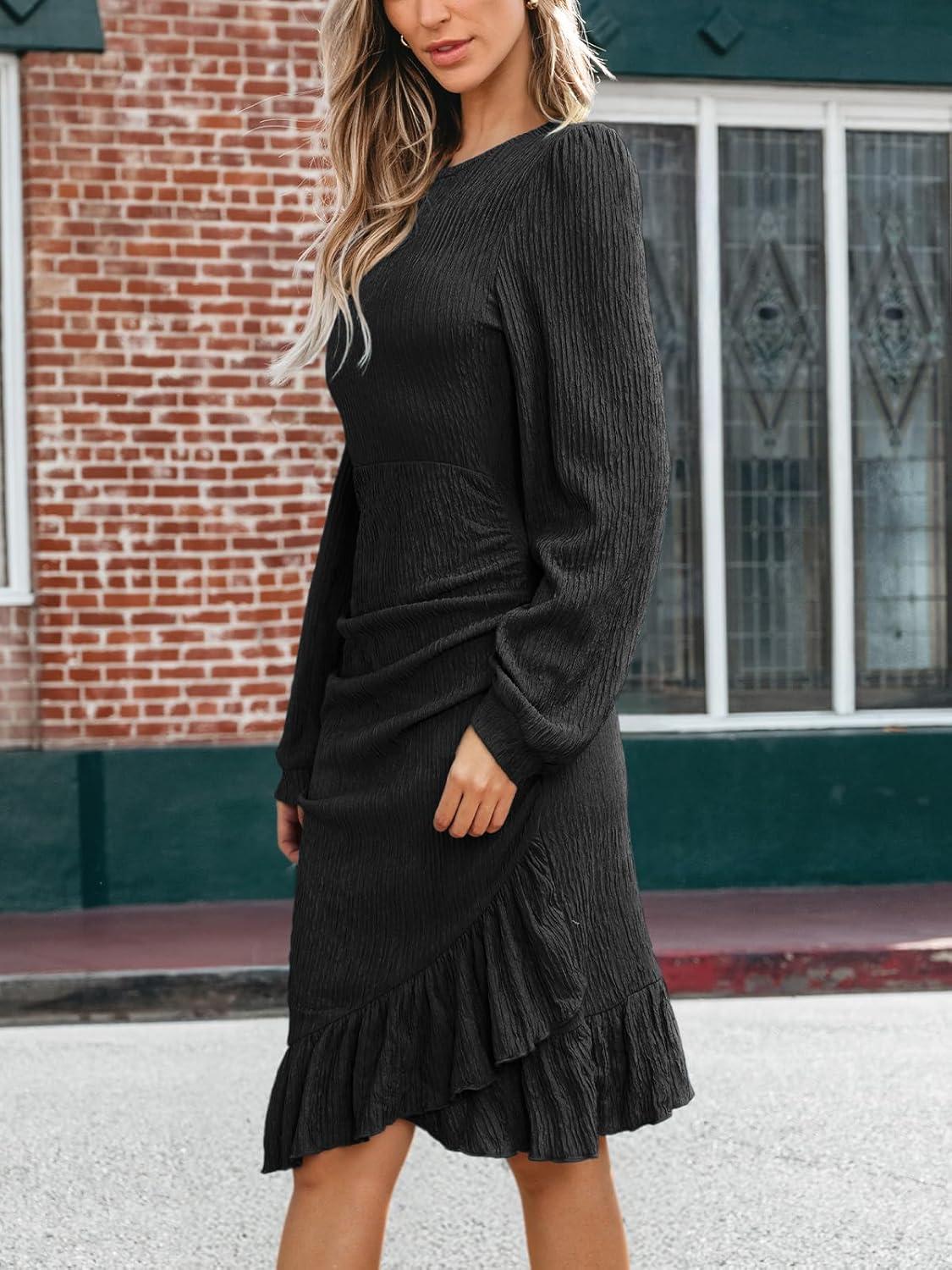 CUPSHE Women Fall Dresses Ruffle Hem Knit Ruched Crew Neck Long Sleeve Bodycon Cocktail Mini Dress(Black)