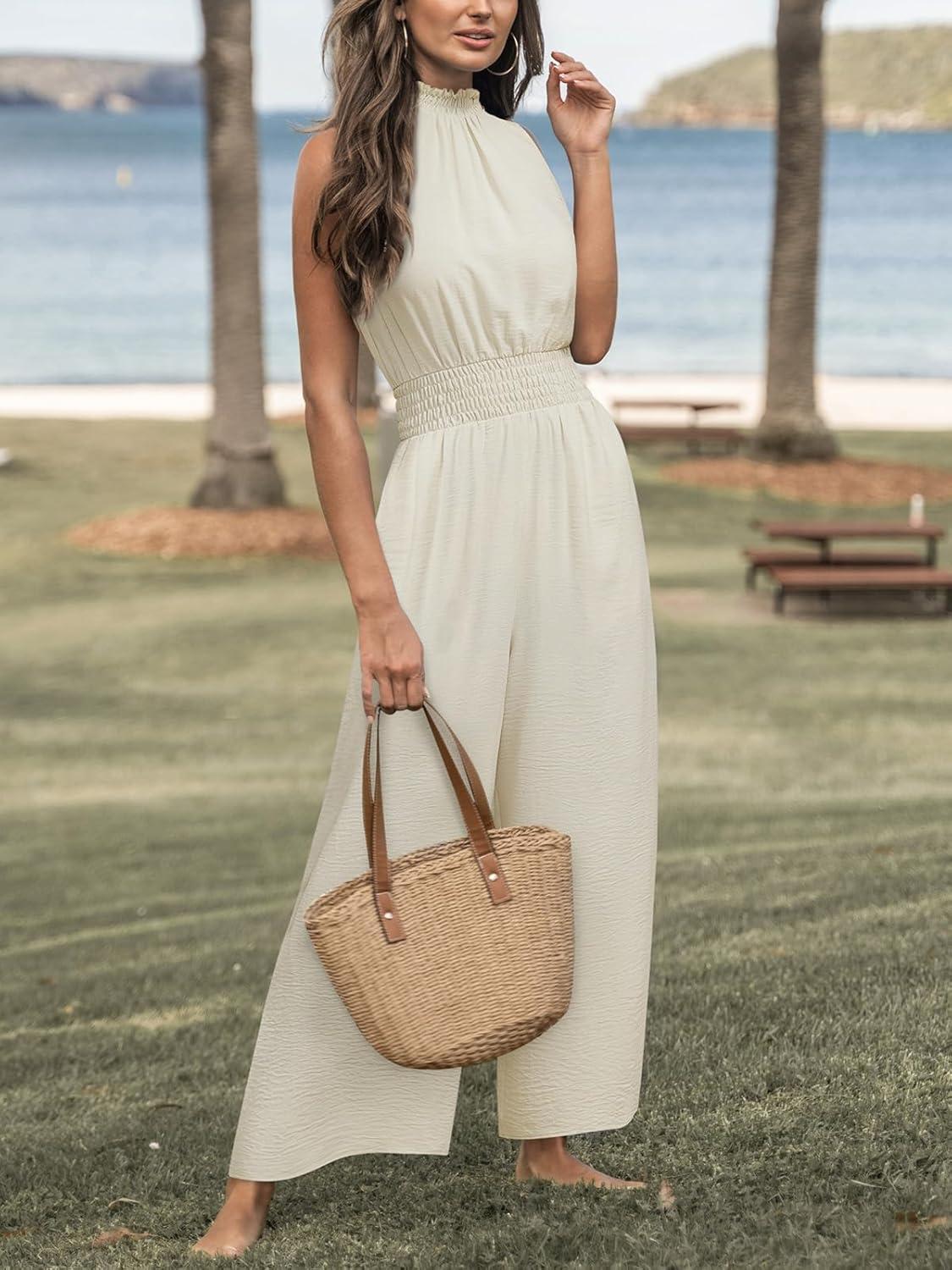 imageCUPSHE Women Floral Summer Maxi Jumpsuit with Pocket Mock Neck Elastic Waist Wide Leg Business Wedding Casual Holiday DressyBeige
