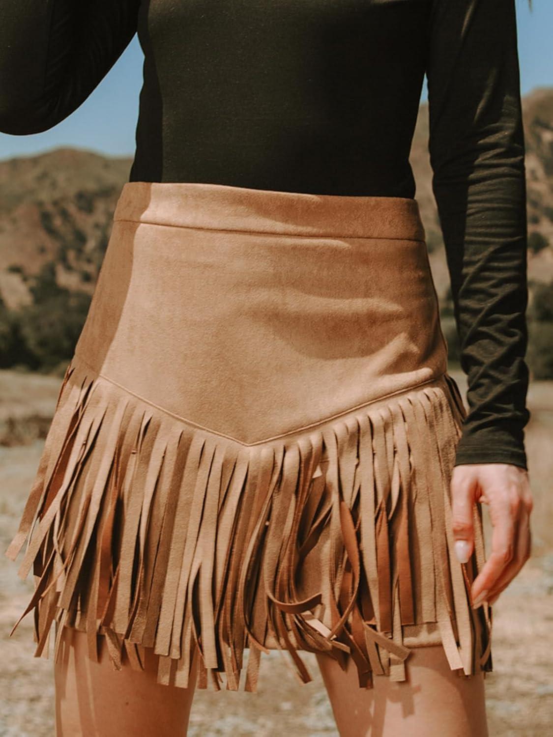 CUPSHE Women Fringe Skirts Western Cowgirl Terra Cotta High Waist Mini Skirt Suede Tassel Short Counrty Concert(Camel)