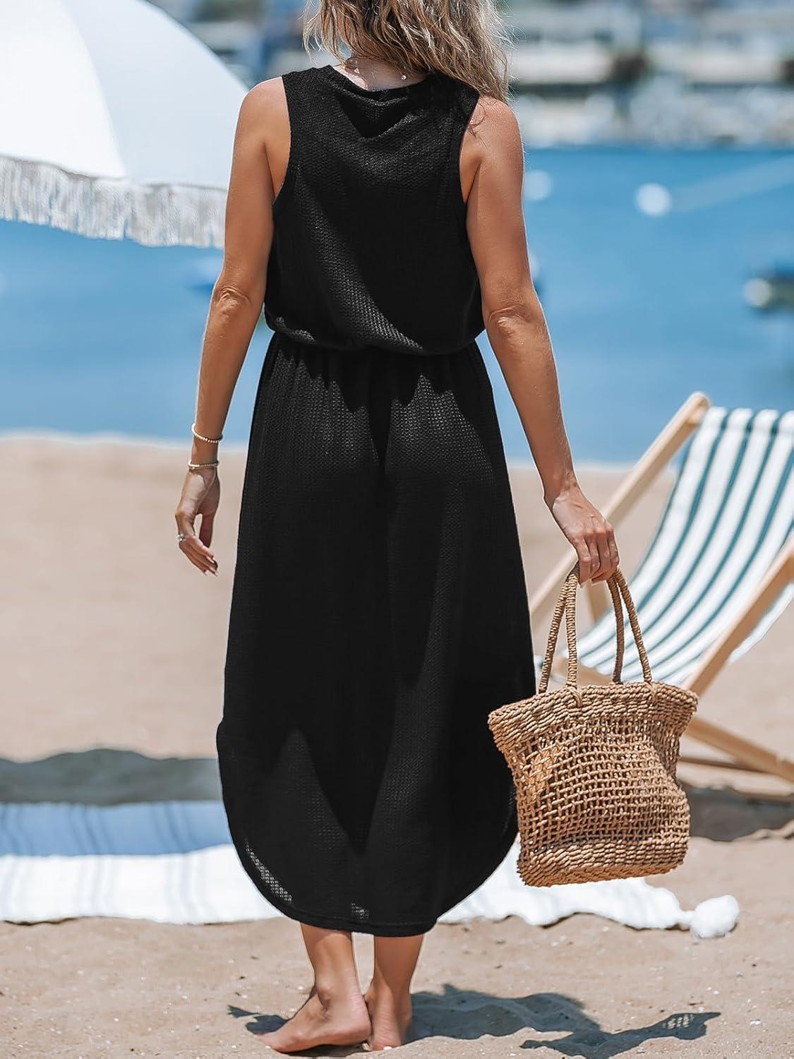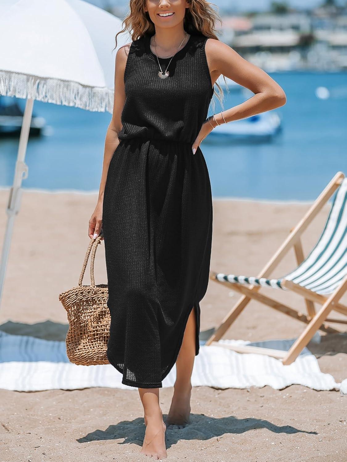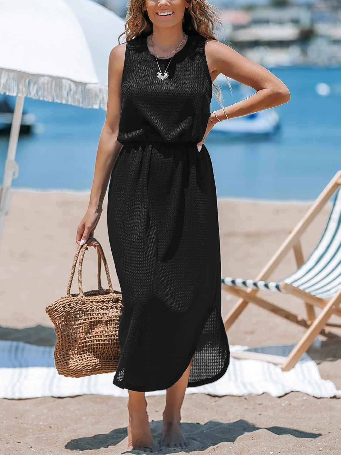 CUPSHE Women Knit Summer Dress Cover Up Crew Neck Elastic Waist Side Slit Midi Casual Sundress Beach Cover Up Dresses(Black Waffle)