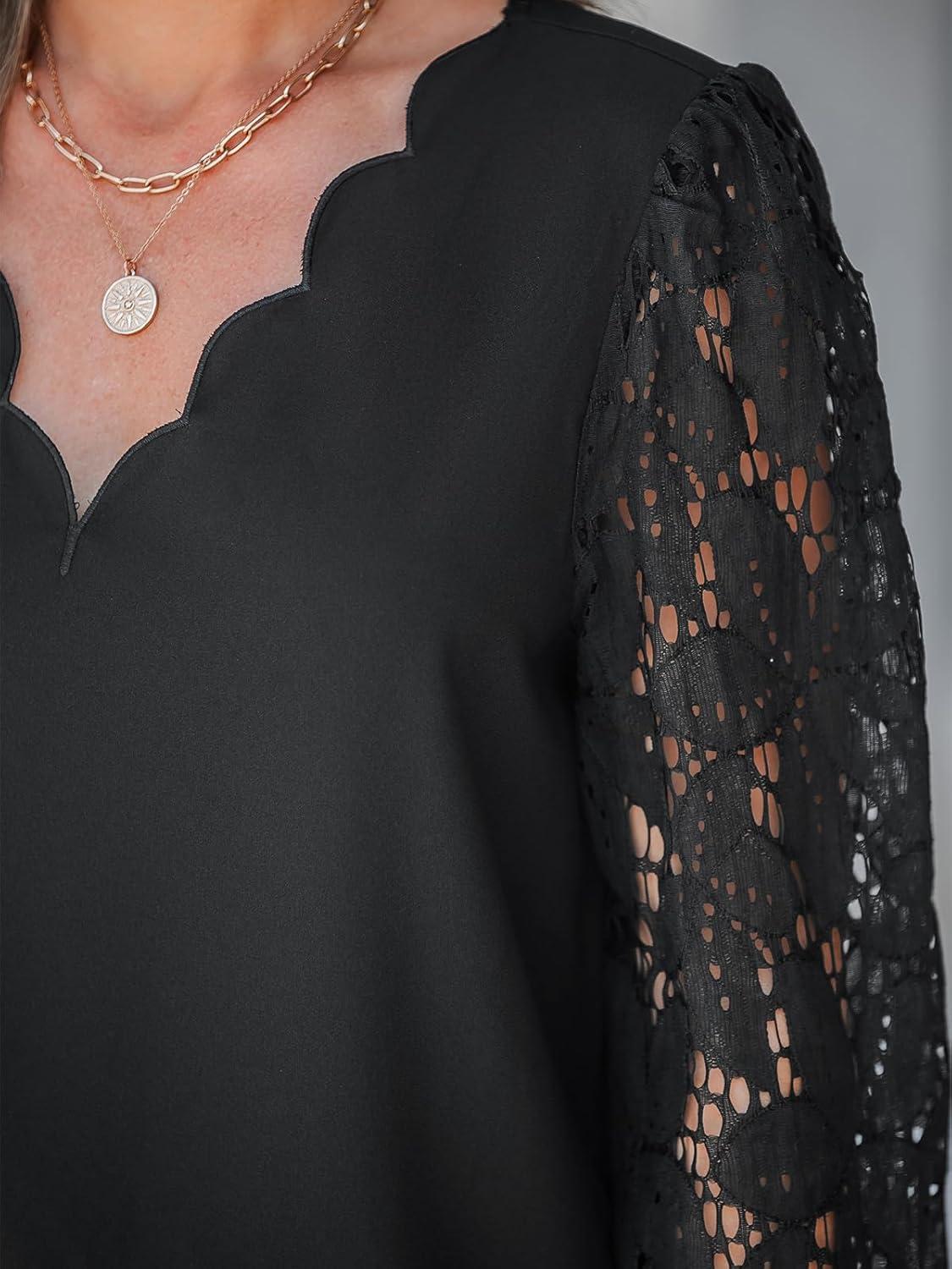 CUPSHE Women Lace Elegant Blouse Long Sleeve Eyelet V Neck Dressy Party Floral Tops Scalloped V Neck(Black)