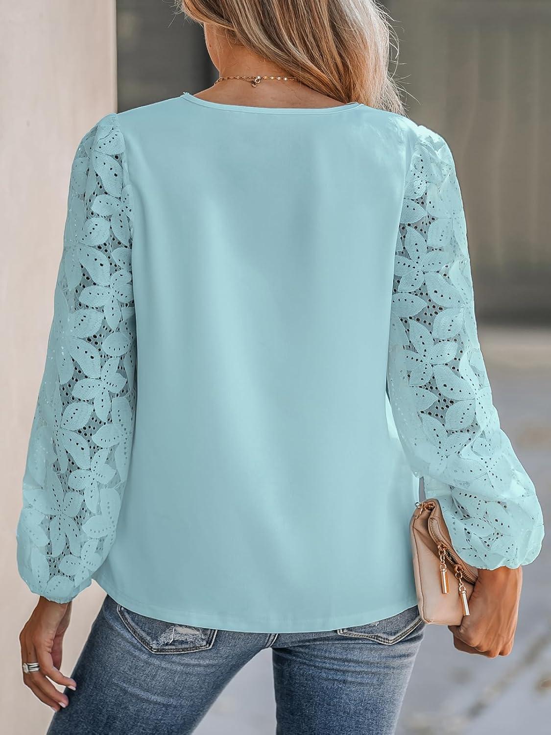CUPSHE Women Lace Elegant Blouse Long Sleeve Eyelet V Neck Dressy Party Floral Tops Scalloped V Neck(Blue)