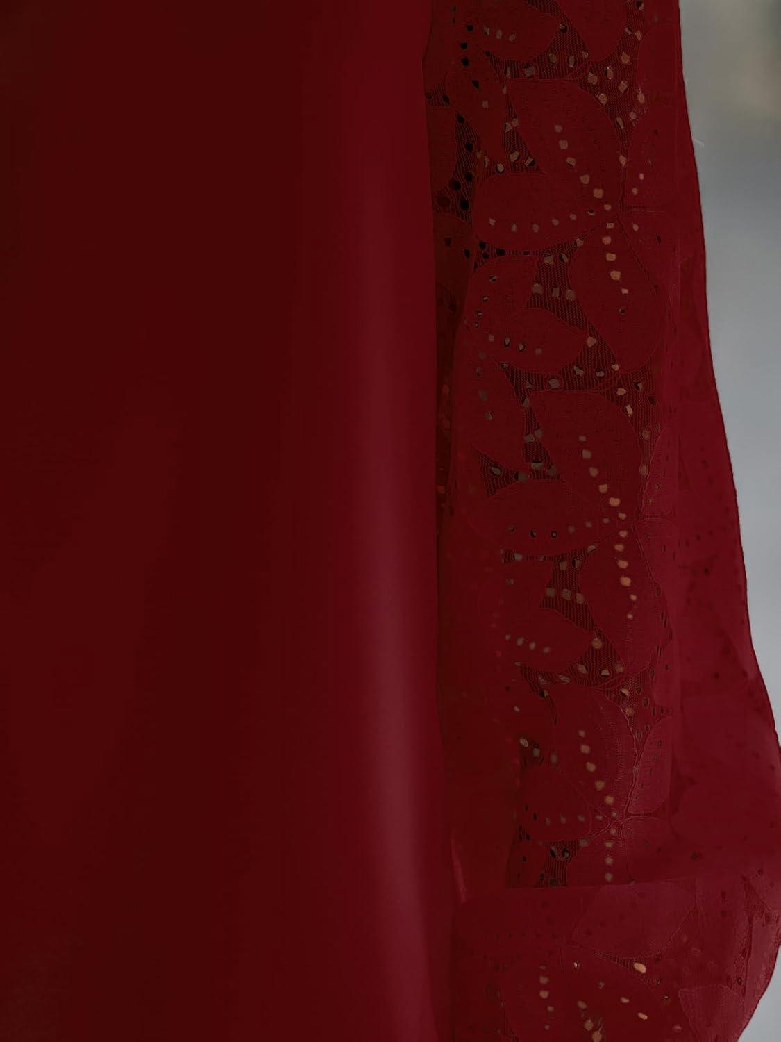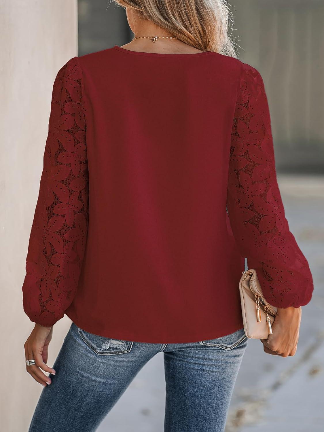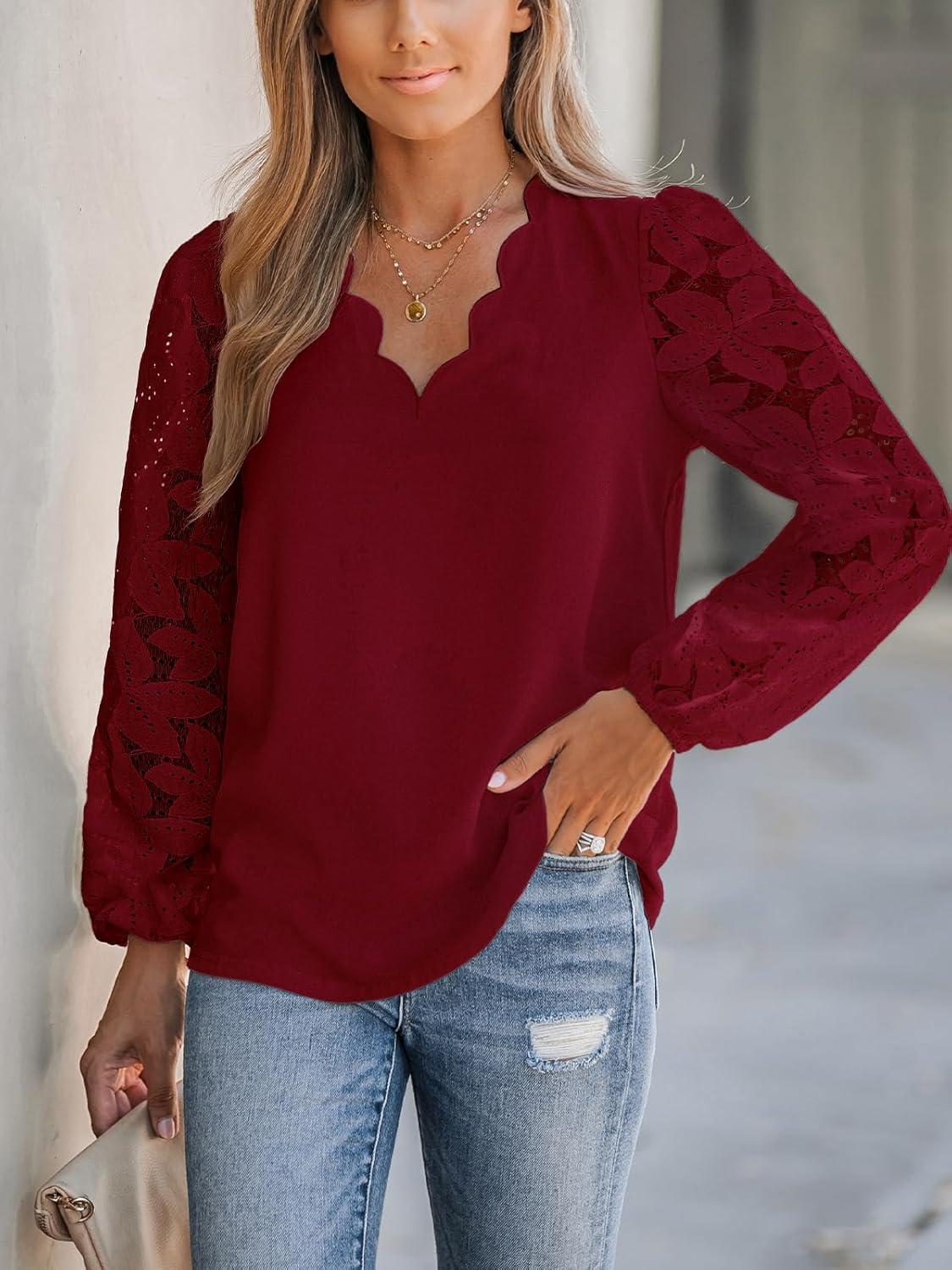 CUPSHE Women Lace Elegant Blouse Long Sleeve Eyelet V Neck Dressy Party Floral Tops Scalloped V Neck(Red)