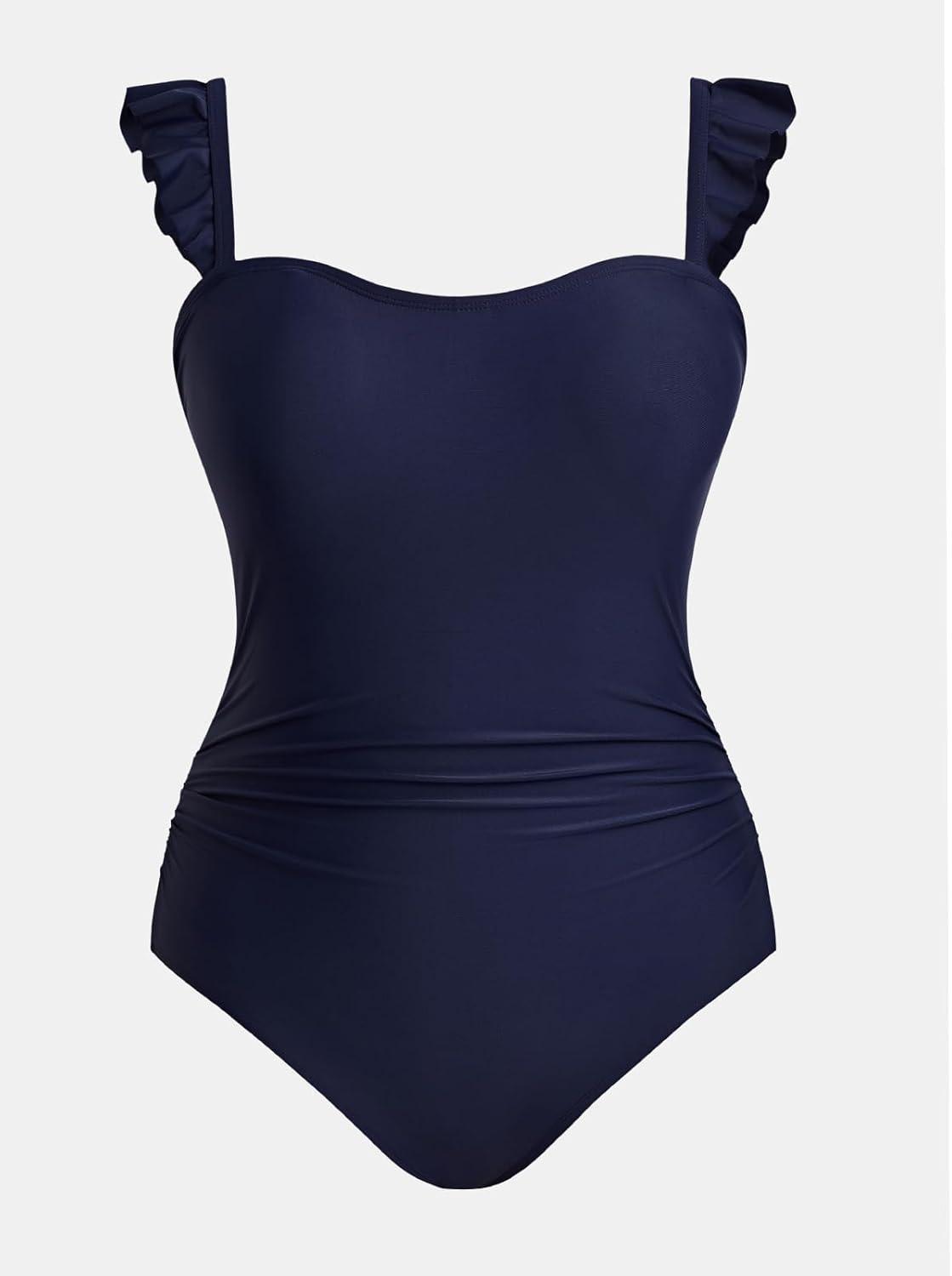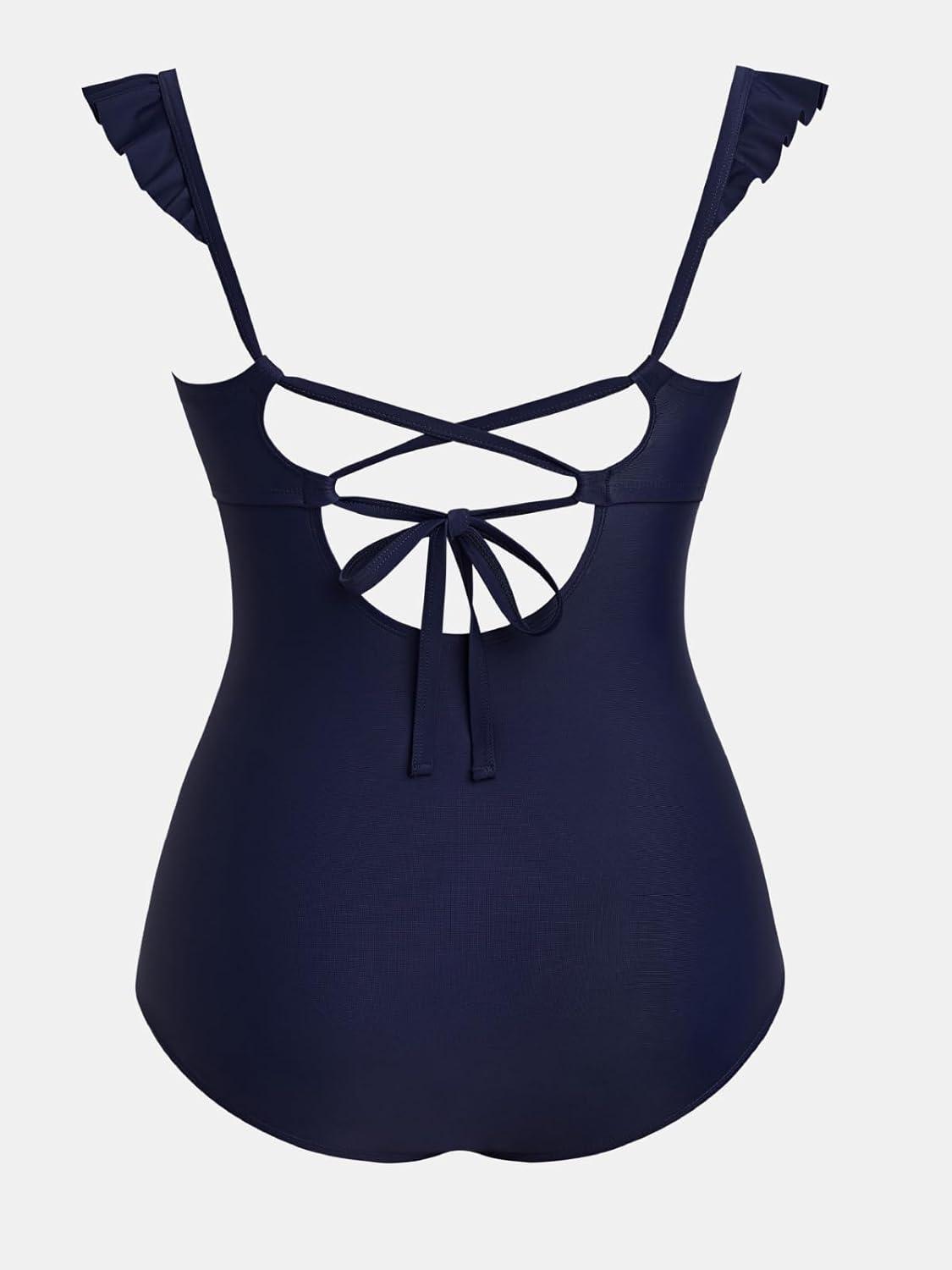 CUPSHE Women Plus Size One Piece Swimsuit Ruffle Straps Square Neck Tummy Control Bathing Suit Crossback Back Self Tie(Navy Blue)
