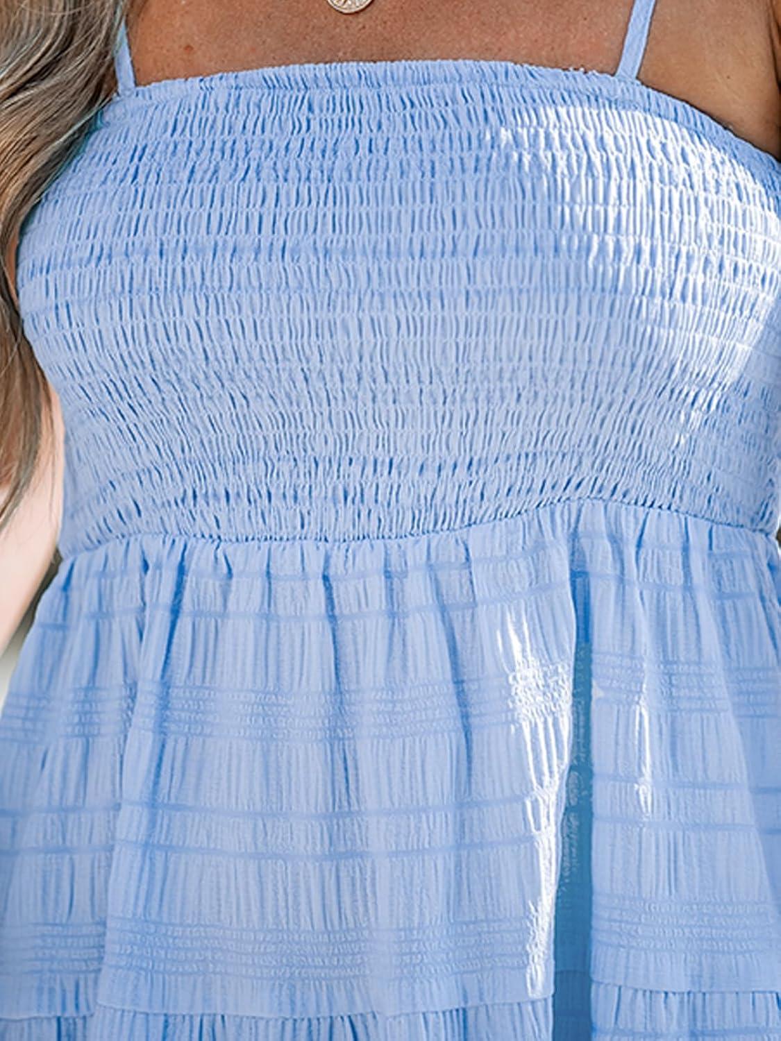 CUPSHE Women Ruffle Mini Summer Dress Spaghetti Straps Square Neck Backless Smocked Bodice A Line Spring Beach Dresses(Baby Blue)