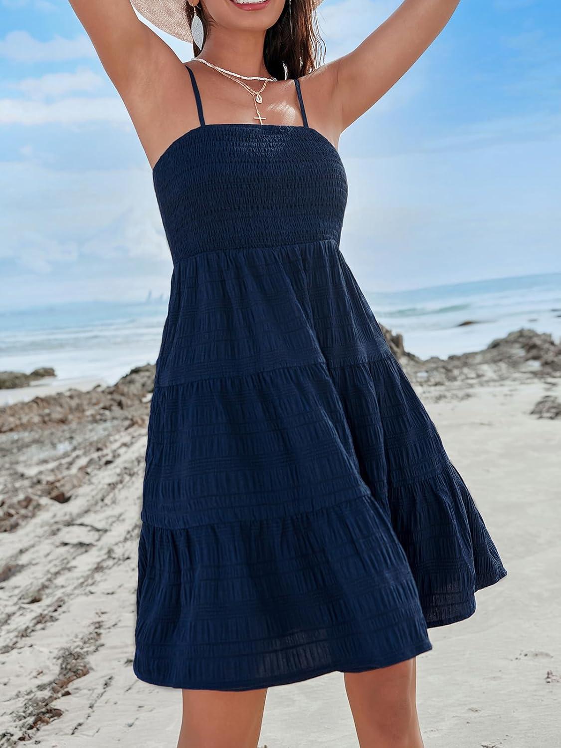 CUPSHE Women Ruffle Mini Summer Dress Spaghetti Straps Square Neck Backless Smocked Bodice A Line Spring Beach Dresses(Navy Blue)