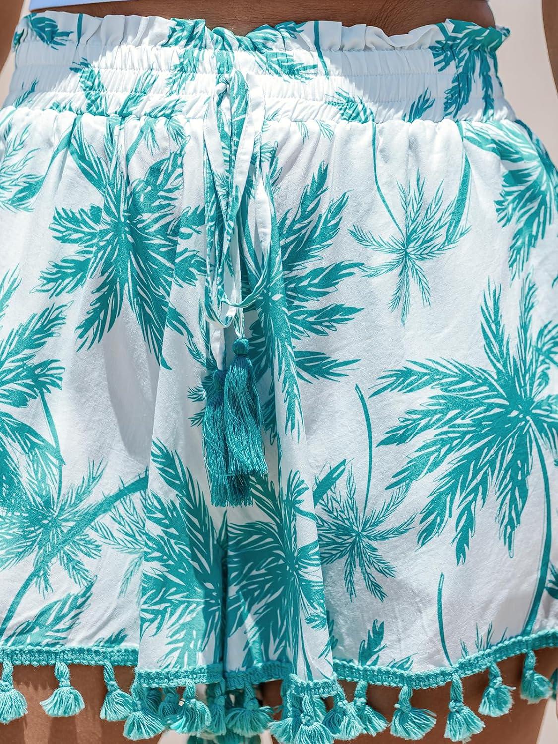 CUPSHE Women Smocked Wasit Swimsuit Cover Up Shorts Wide Leg Beach Shorts for Swimwear(Tropical Patterned)