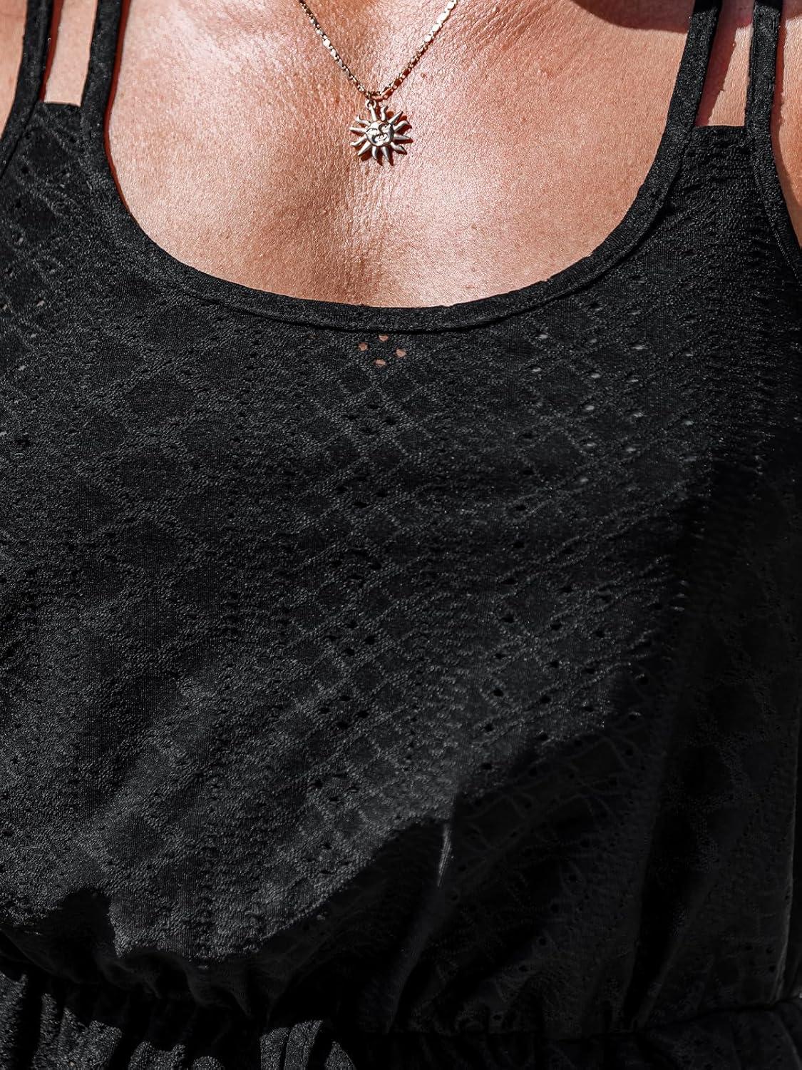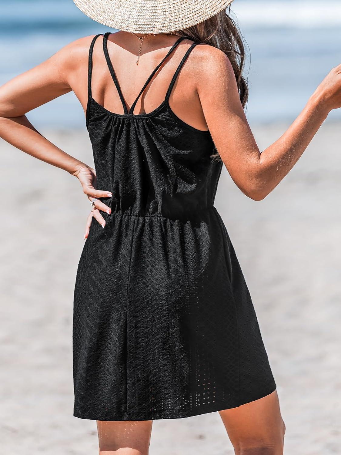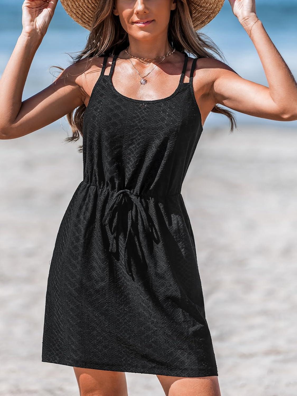 CUPSHE Women Swimsuit Cover Up Sleevess Spaghetti Straps Summer Mini Beach Dress Tie Waist Bathing Suit Coverups for Swimwear(Black)