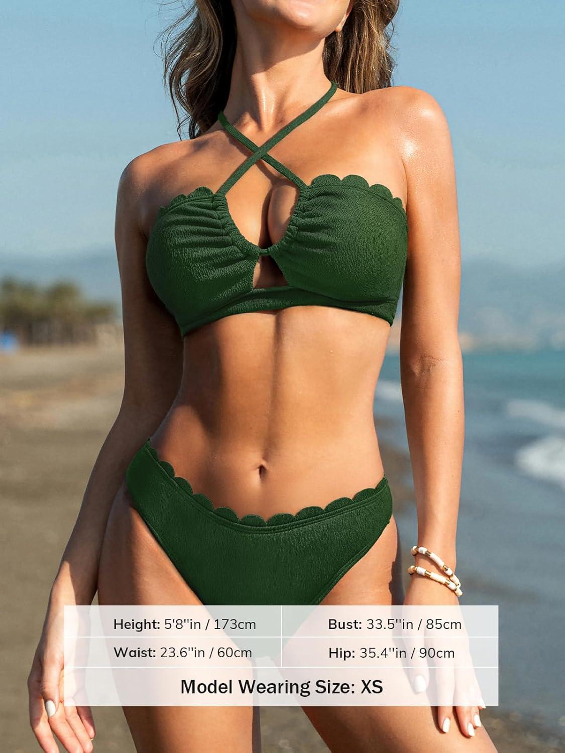 CUPSHE Women’s Bikini Sets Adjustable Halter Strappy Swimsuit Crisscross Cutout Scalloped Mid Rise(Forest Green)