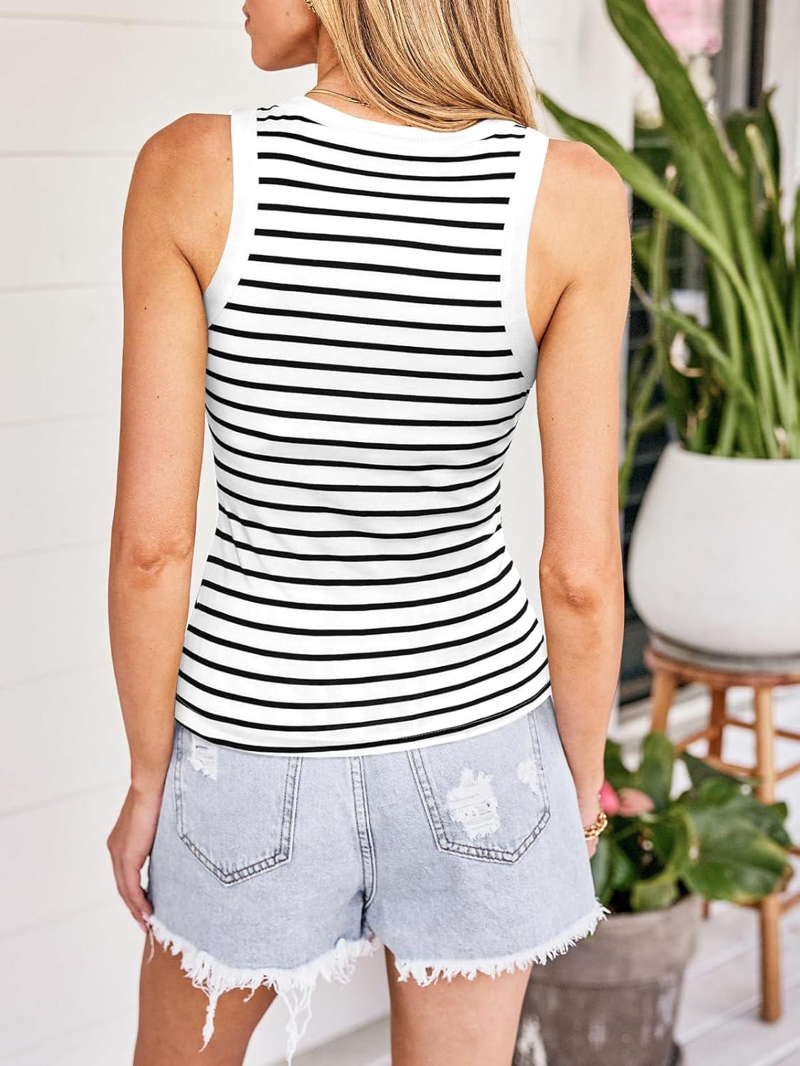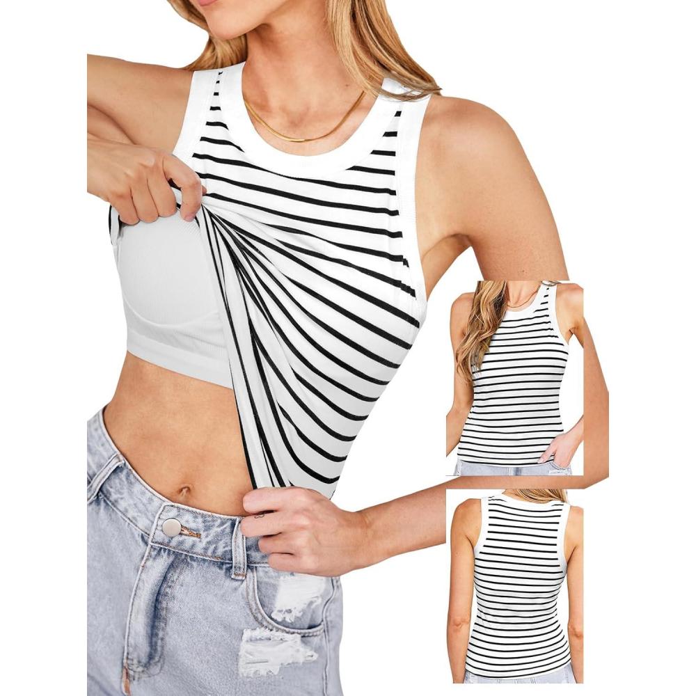 CUPSHE Womens Built in Bra Tank Tops Ribbed Sleeveless 2025 Summer Basic Tops(Striped)