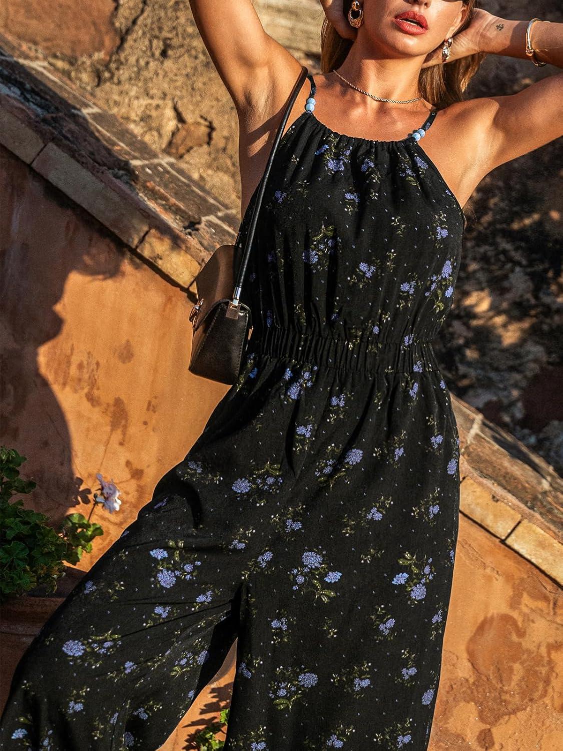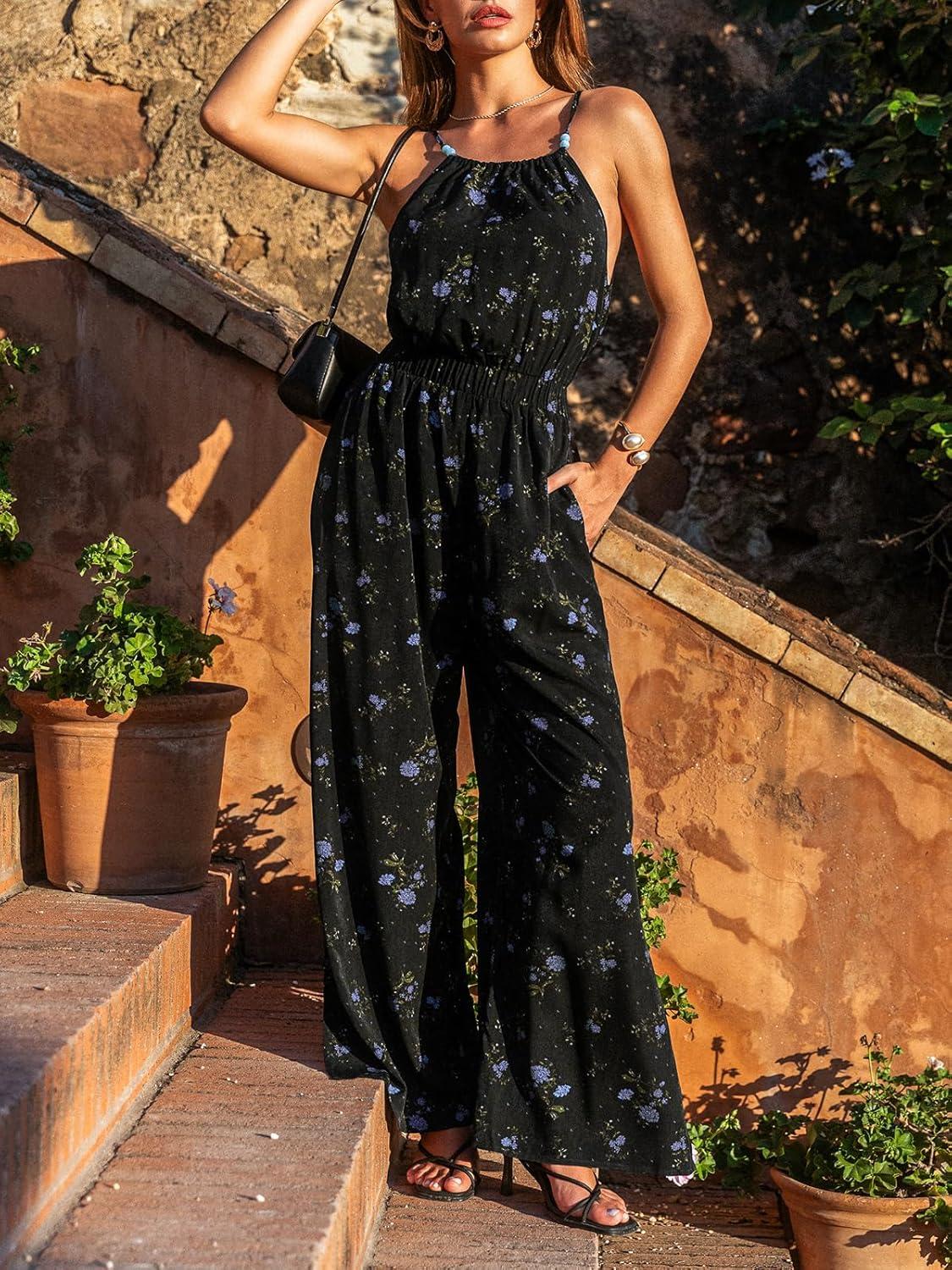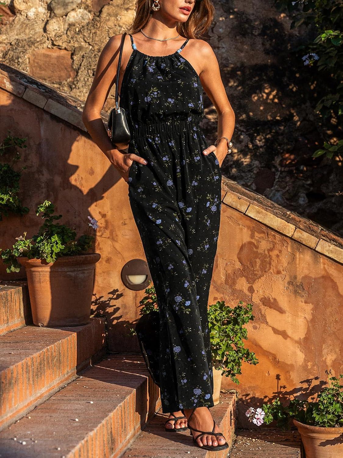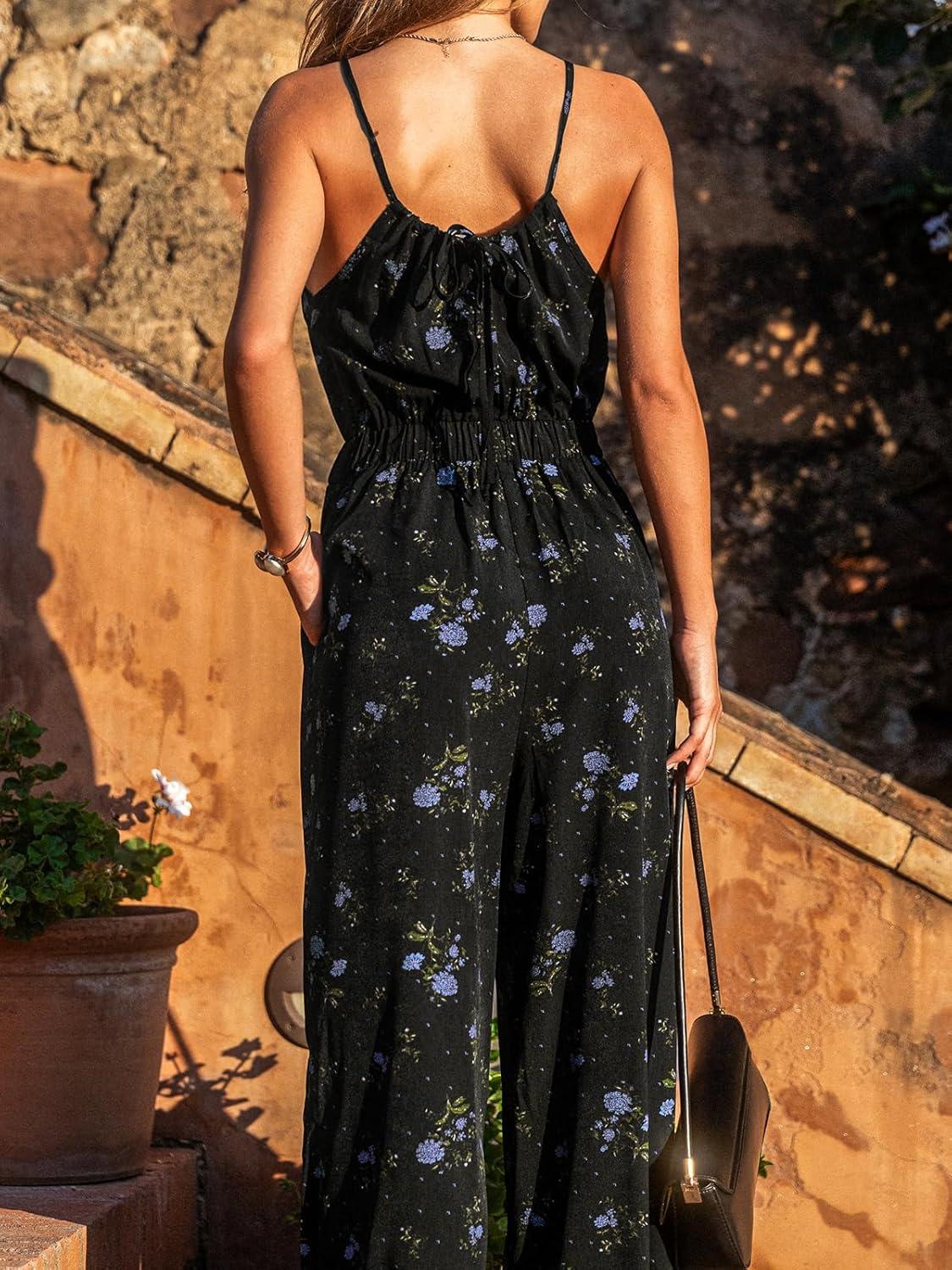 CUPSHE Women's Casual Loose Overalls Jumpsuits High Neck Sleeveless Wide Leg Boho One Piece Rompers With Pockets(Floral Black)