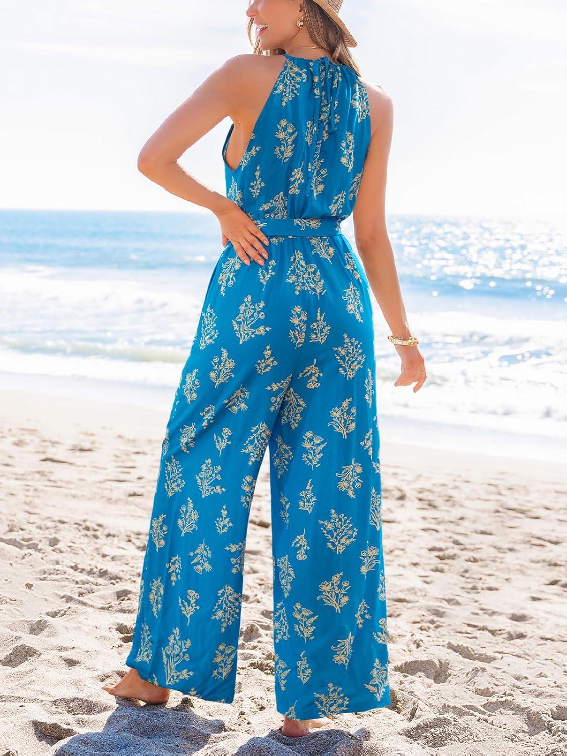 CUPSHE Women's Casual Loose Overalls Jumpsuits High Neck Sleeveless Wide Leg Boho One Piece Rompers With Pockets(Floral Blue)