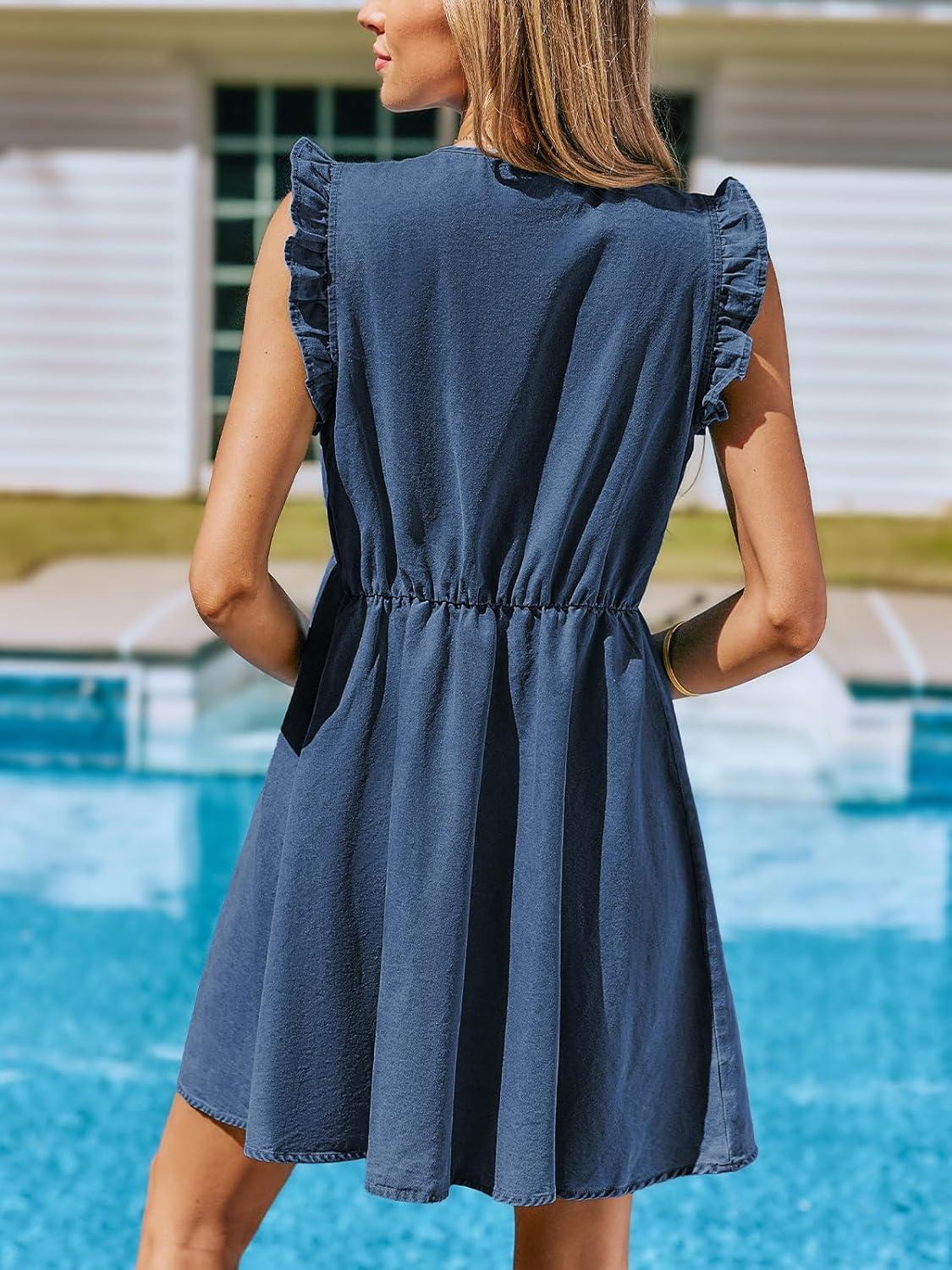 CUPSHE Women’s Denim Summer Dresses Cotton Plunging V Neck Casual Sundress Ruffle Sleeves Mini Dress(Denim Blue)