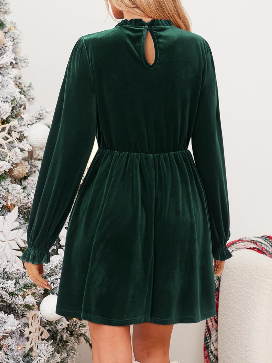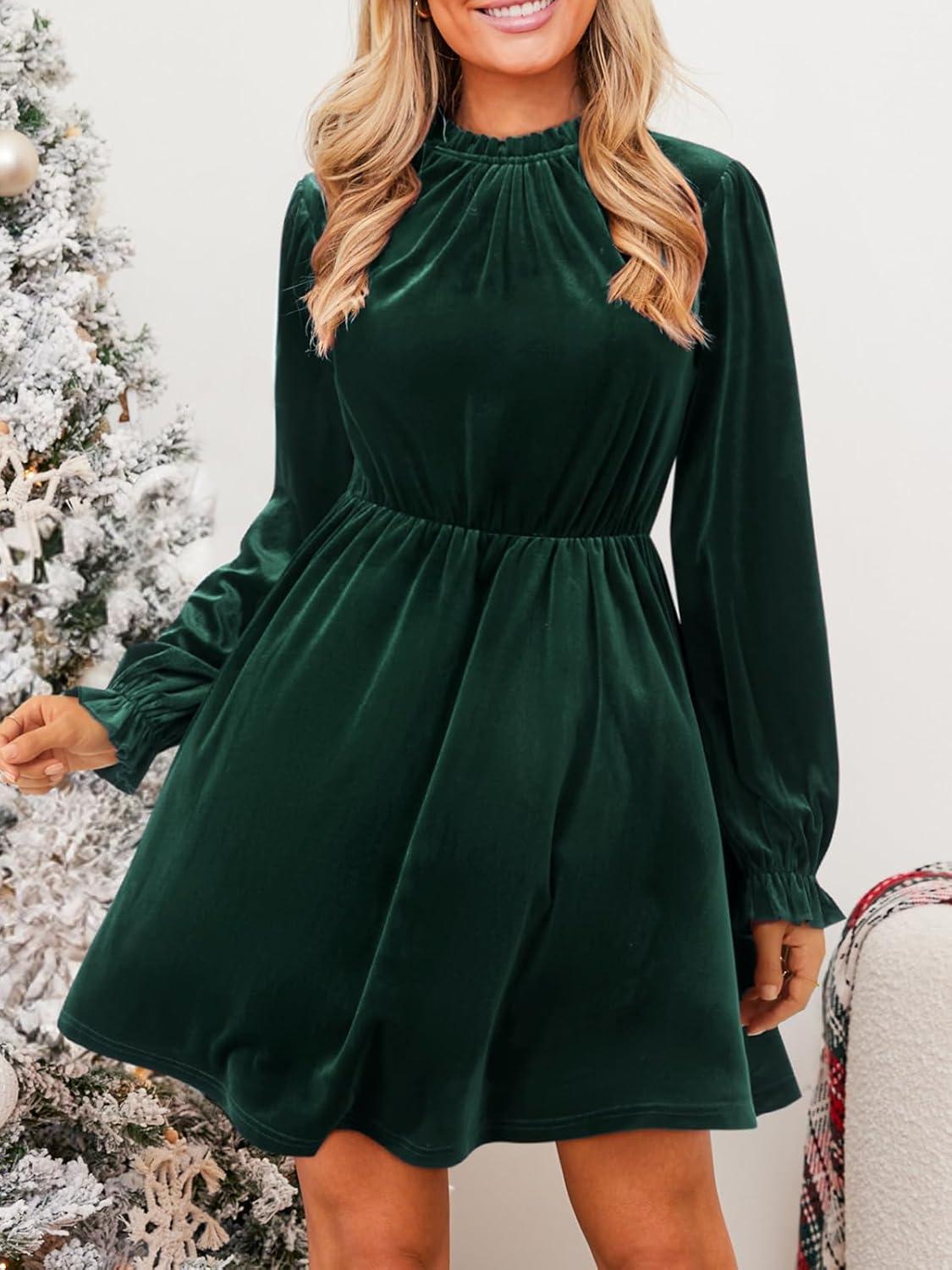 CUPSHE Women's Fall Dresses 2025 High Neck Long Sleeve Mini Party Ruffled Casual Tunic Velvet Wedding Guest Dress(Green)