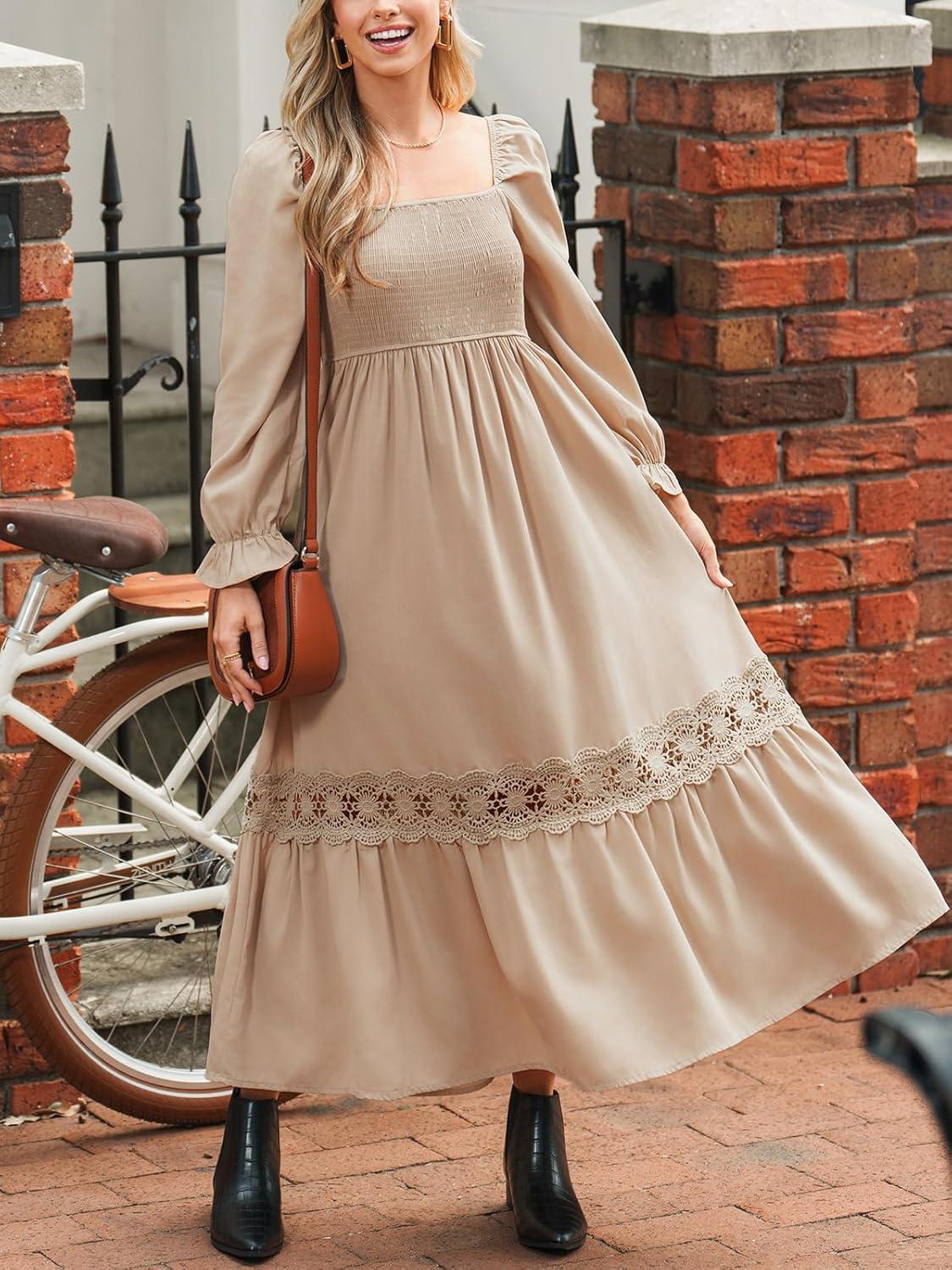 CUPSHE Womens Fall Dresses 2025 Square Neck Smocked Long Sleeve Ruffled Lace Long Formal A Line Maxi Wedding Guest Dress(Beige)