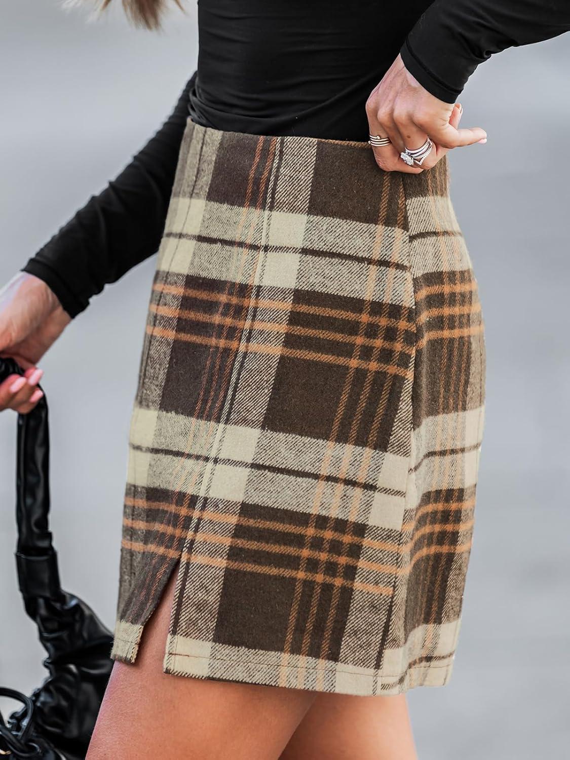 CUPSHE Women’s High Waist Plaid Skirt Causal Bodycon Pencil Wool Mini Skirts Winter Fall A Line Elegent Outfits(Brown)