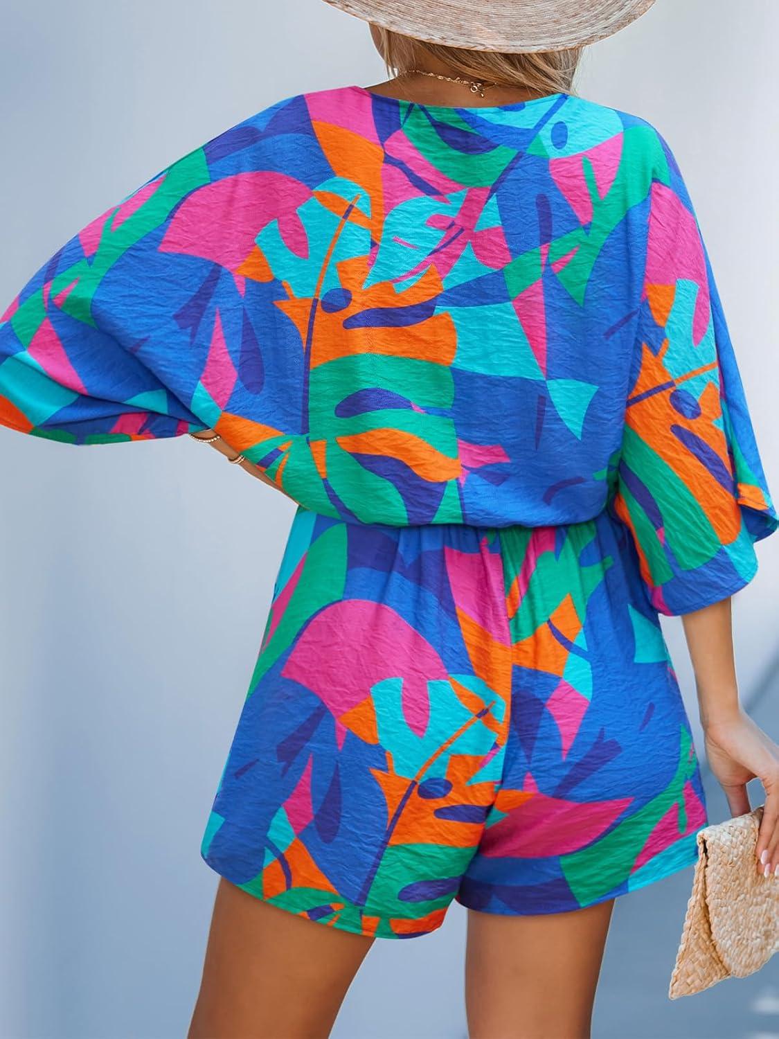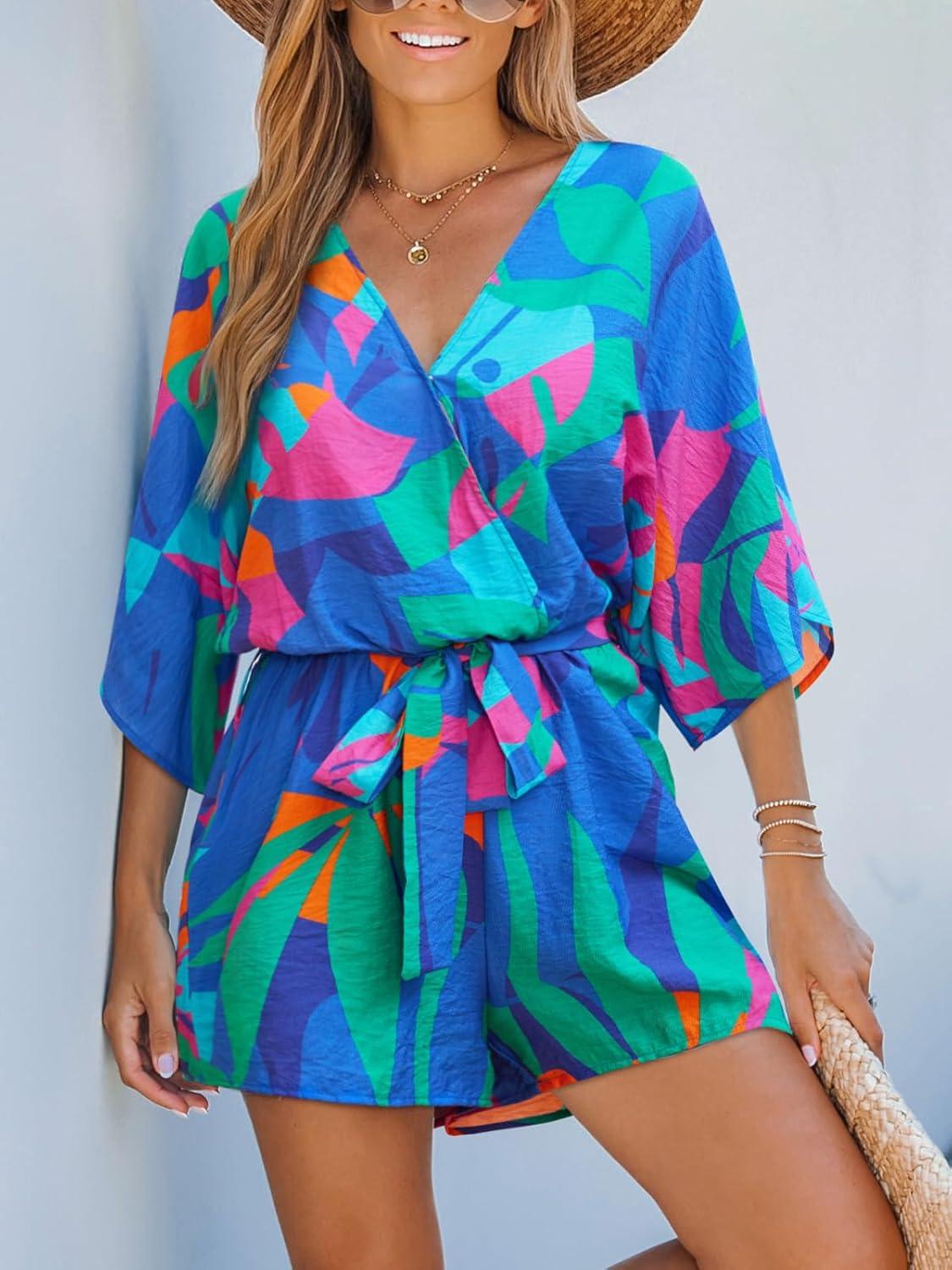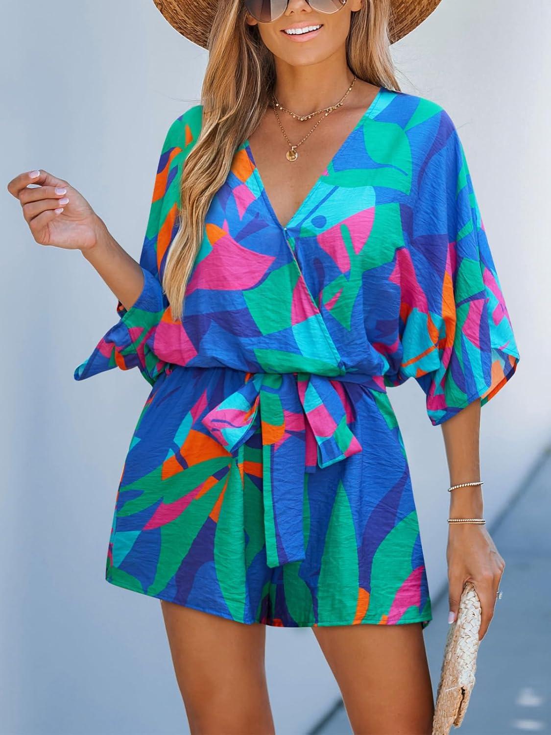 CUPSHE Women’s Jumpsuits Boho Short Sleeve V Neck Wide Leg Overall Tie Outfit Casual Beach(Blue Floral)