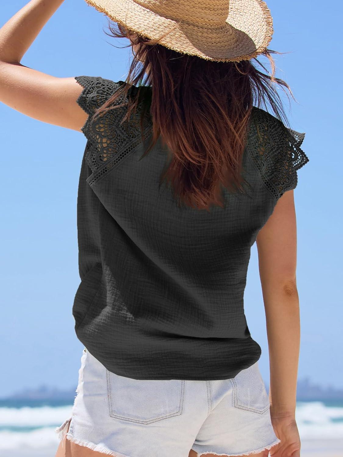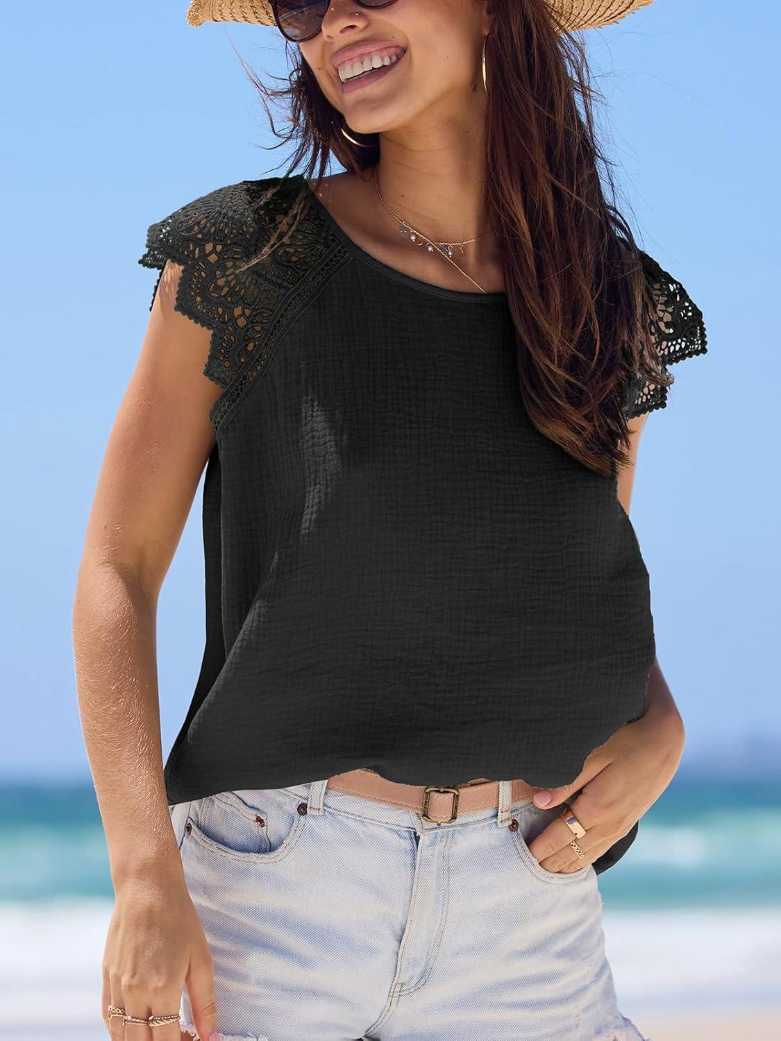 CUPSHE Womens Lace Short Sleeve Tops Cap Sleeve T Shirts 2025 Cute Basic Trendy Fashion Casual Dressy Outfits(Black)