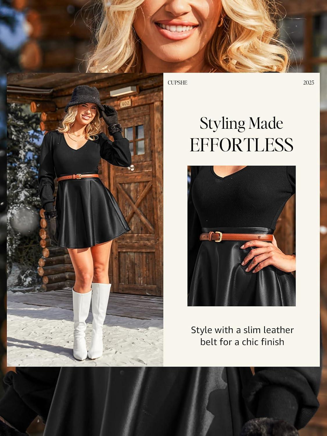 CUPSHE Women’s Long Sleeve Fall Mini Dress V Neck High Waist A Line Ruffle Faux Leather Dress(Black-brown)