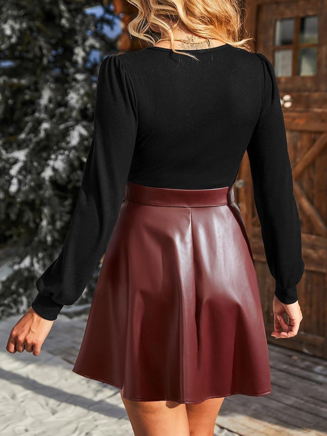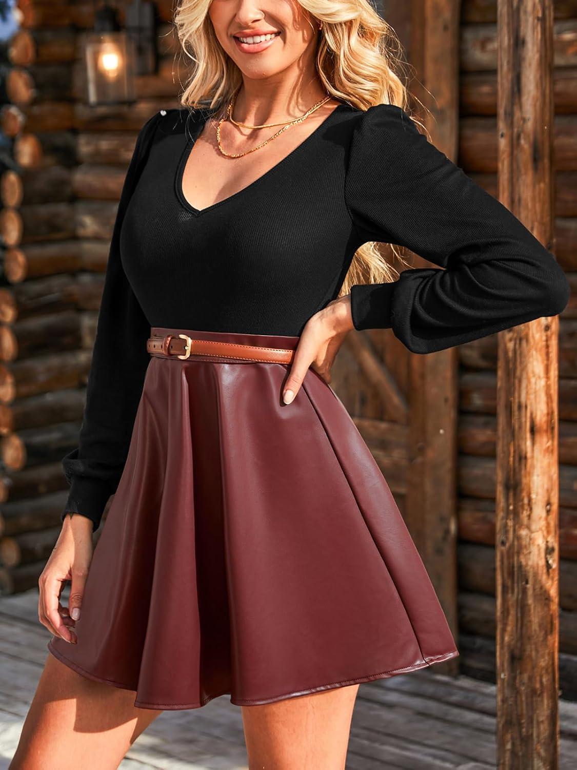 CUPSHE Women’s Long Sleeve Fall Mini Dress V Neck High Waist A Line Ruffle Faux Leather Dress(Black-red)