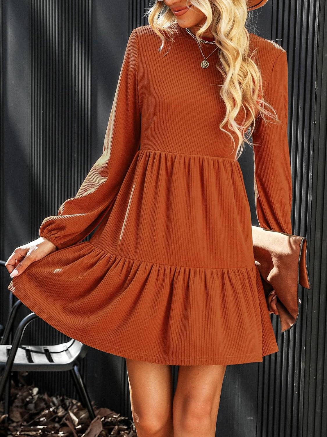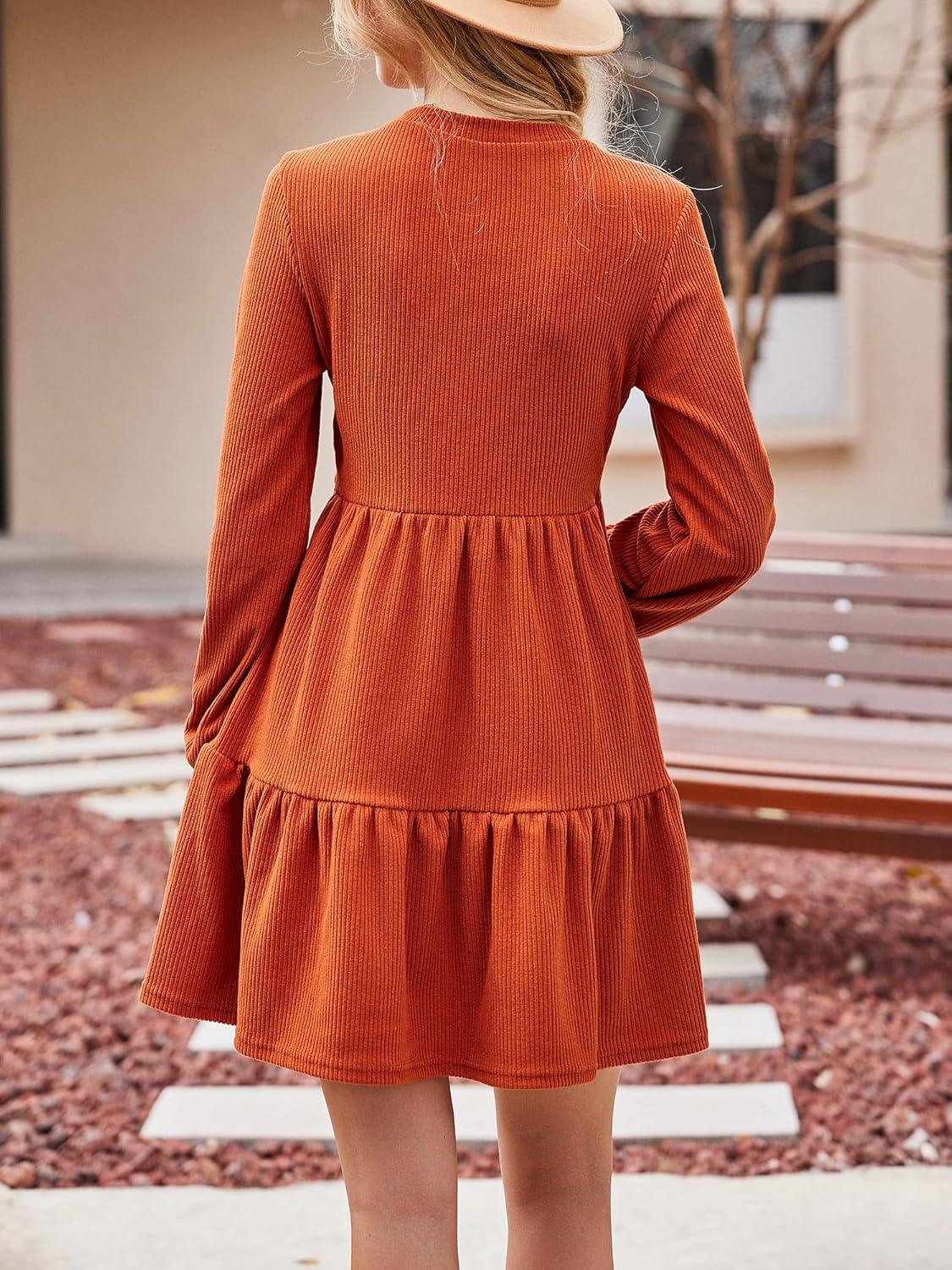 CUPSHE Women's Mini Fall Dresses Knit Casual Long Sleeve Crew Neck Flowy Tiered Ruffled Short Sweater Dress(Burnt Orange)