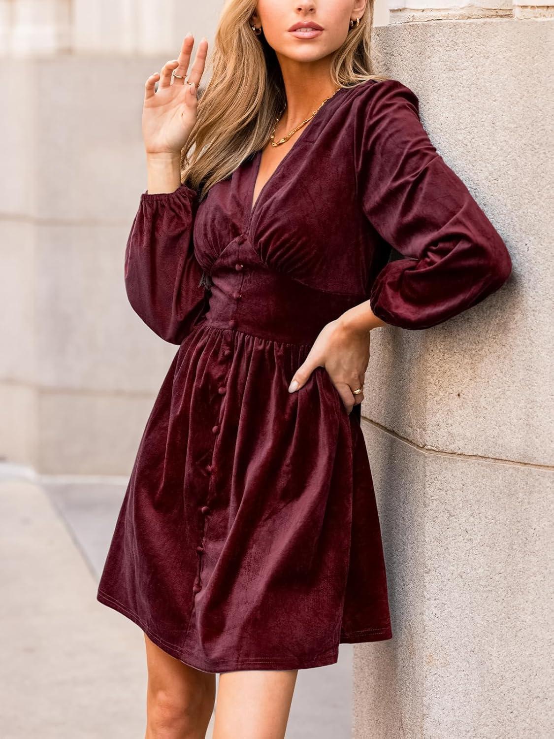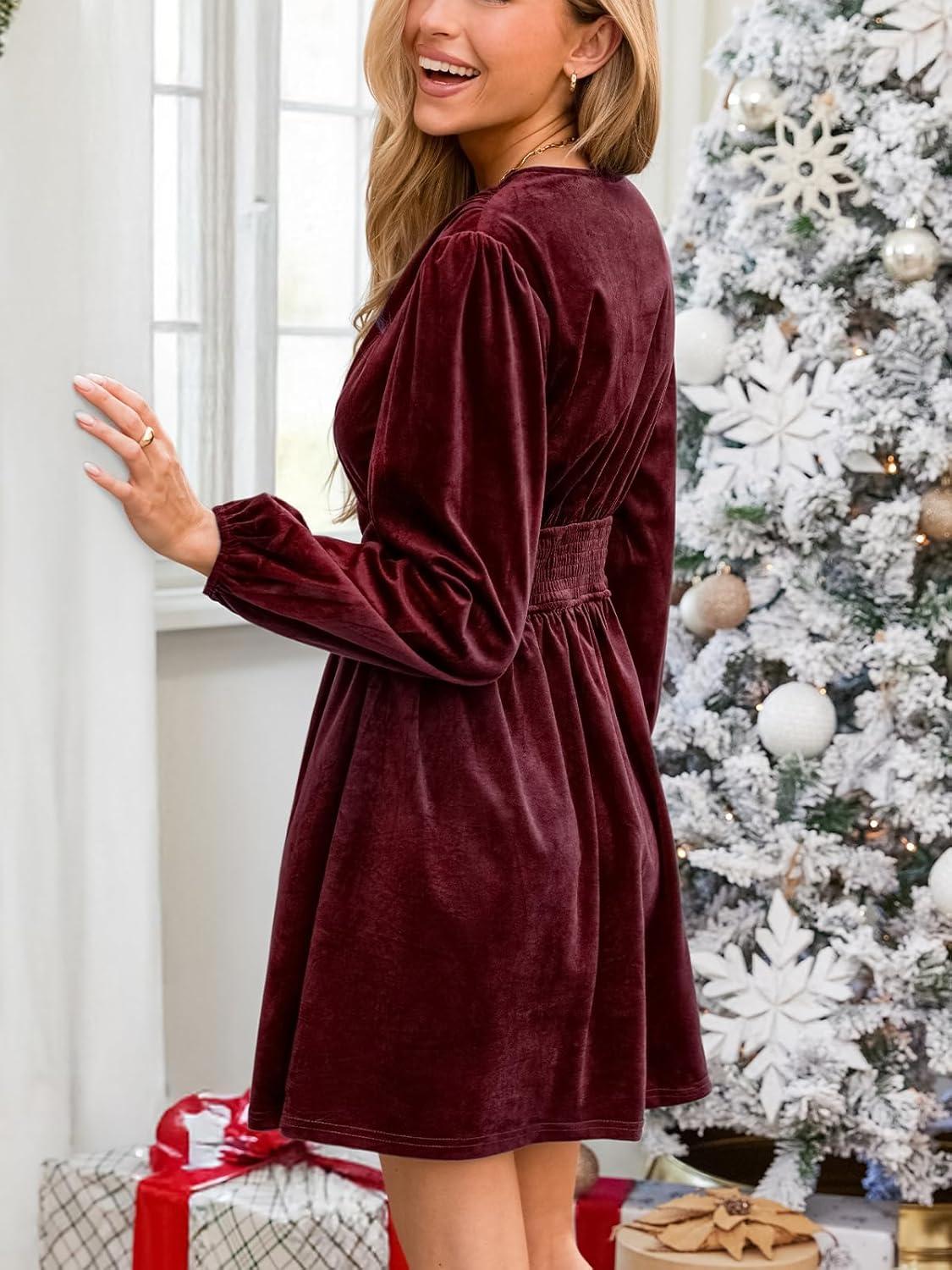 CUPSHE Women’s Mini Party Dresses V Neck Button Long Sleeve Smocked Tunic Waist Casual Short Flowy Fall Cocktail Dress(Burgundy)