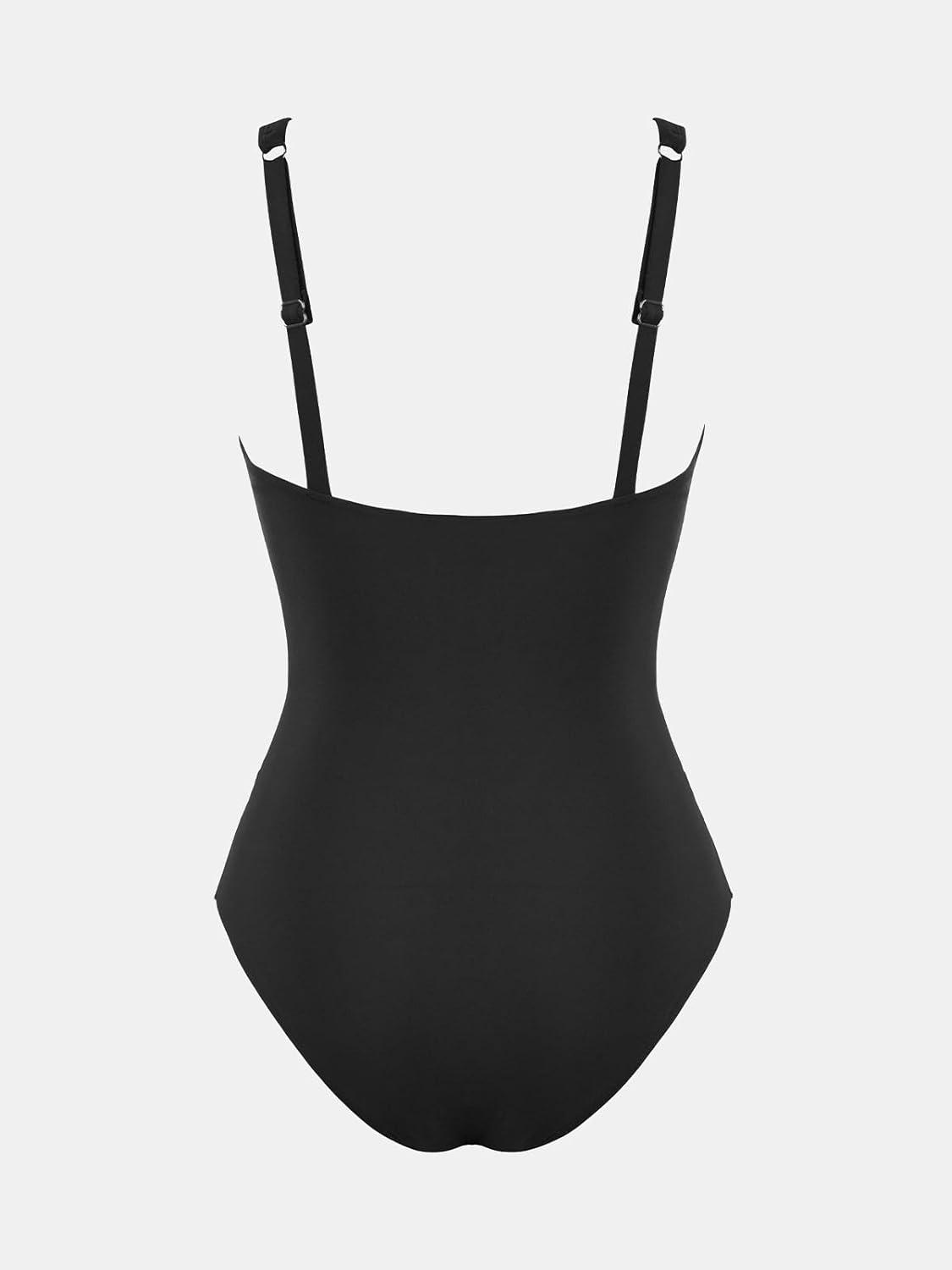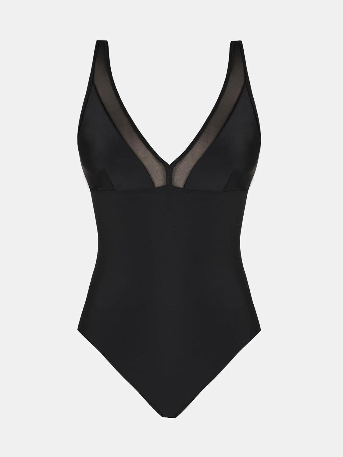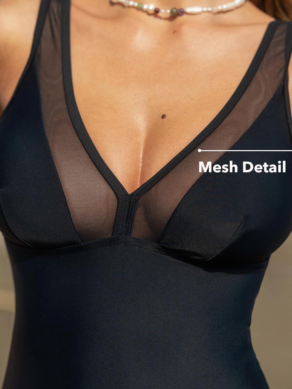 CUPSHE Women’s One Piece Swimsuit Bathing Suit Plunging V Neck Wide Adjustable Straps Mesh(Black)
