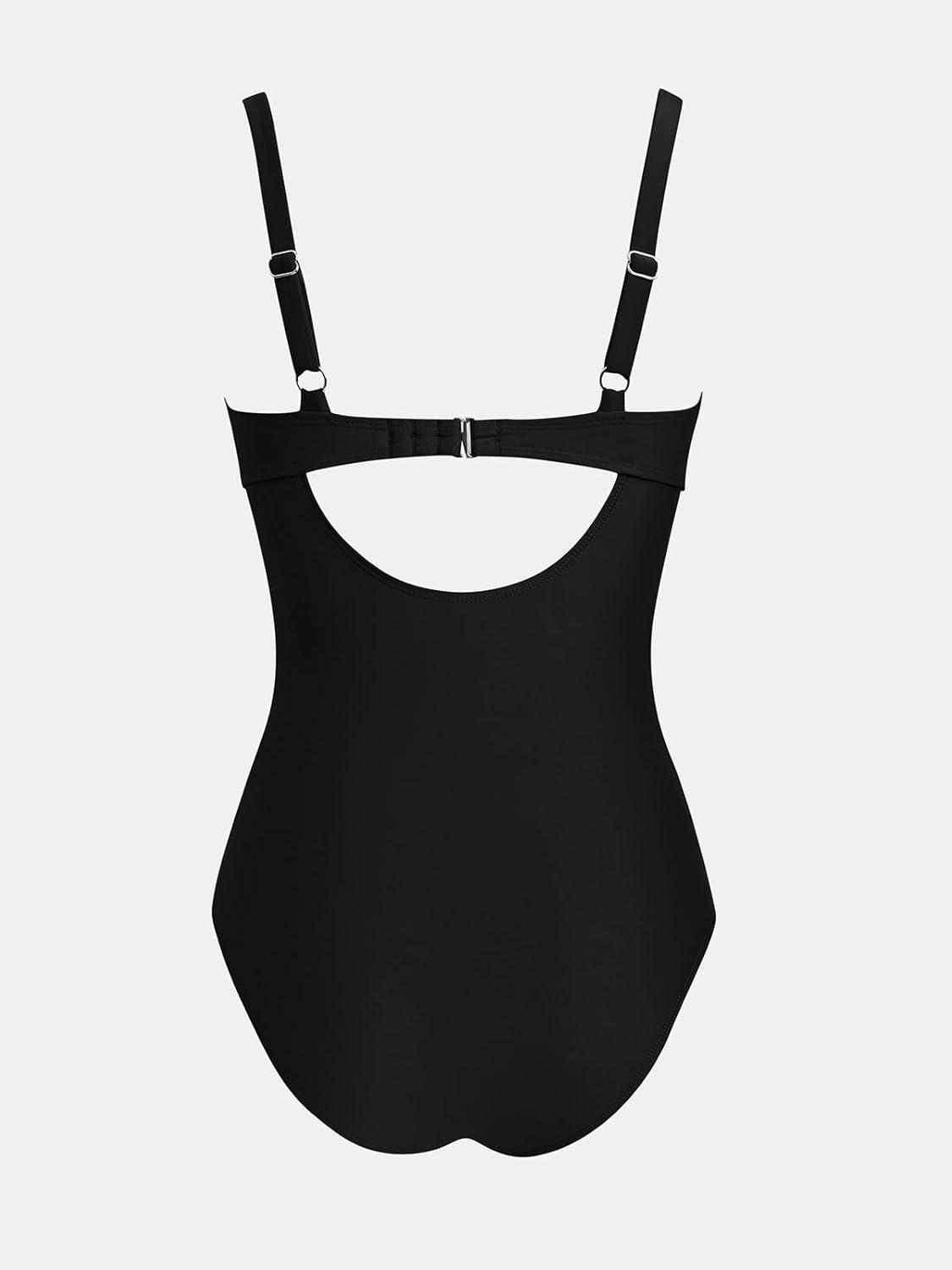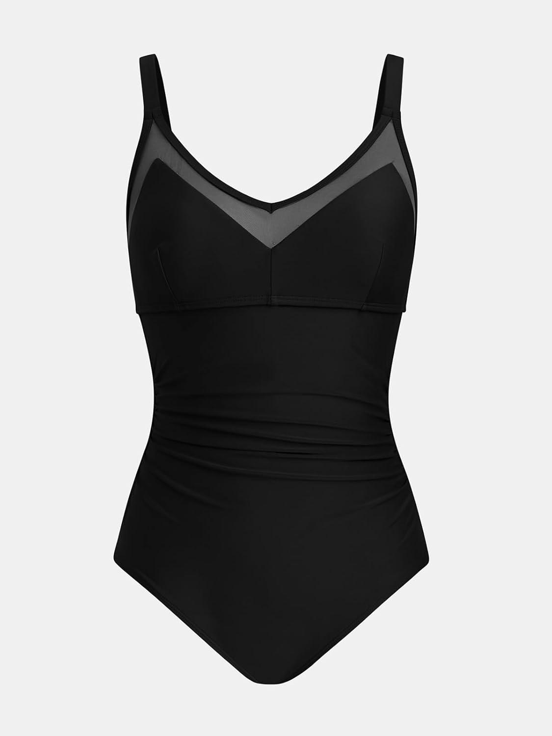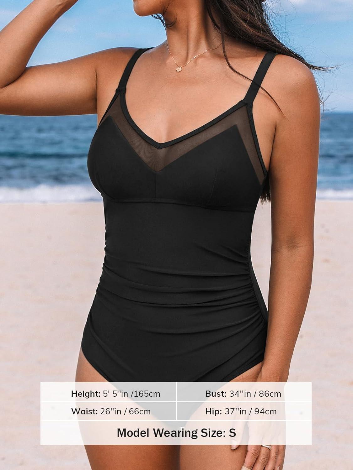 CUPSHE Women's One Piece Swimsuit Bathing Suit V Neck Back Hook Cutout Adjustable Straps Ruched Mesh(Black)