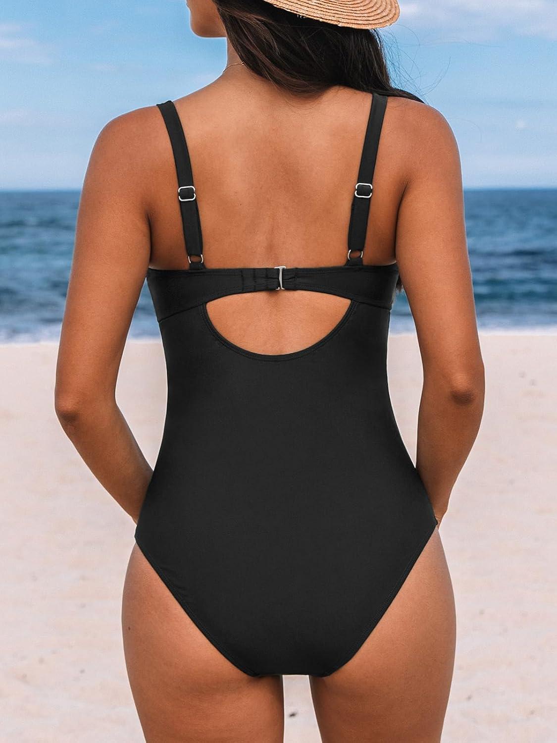 CUPSHE Women’s One Piece Swimsuit Bathing Suit V Neck Back Hook Cutout Adjustable Straps Ruched Mesh(Black)