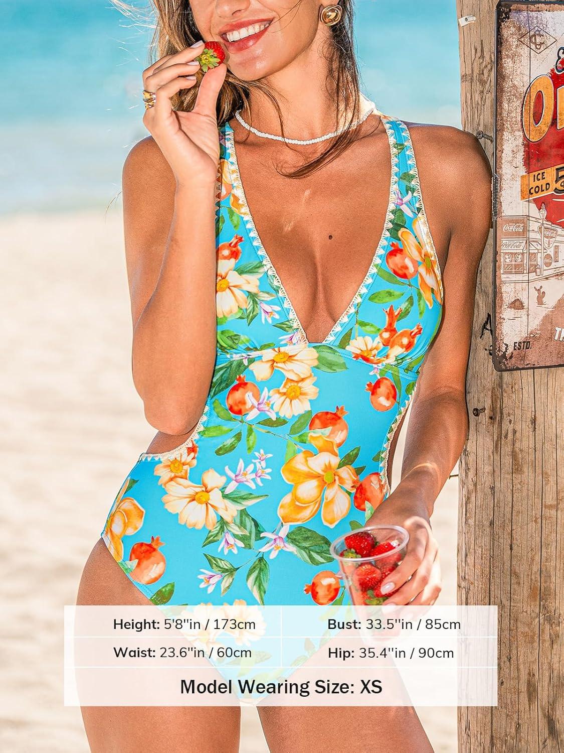 CUPSHE Women’s One Piece Swimsuit Deep V Neck Bathing Suit Cutout Crisscross Back Adjustable Straps Self Tie Stitching(Turquoise Blue/Orange Floral)