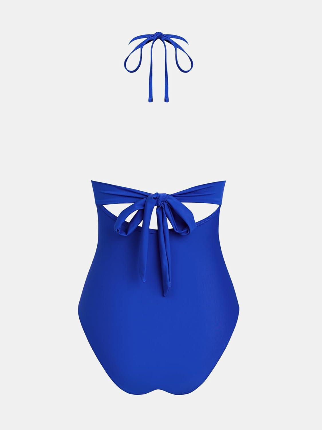 CUPSHE Women's One Piece Swimsuit Halter V Neck Crochet Bathing Suit Cutout Back Adjustable Straps Self Tie Spaghetti(Cobalt Blue)
