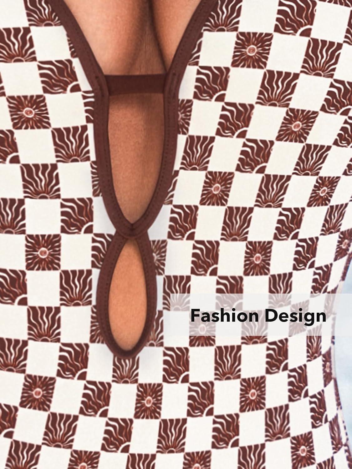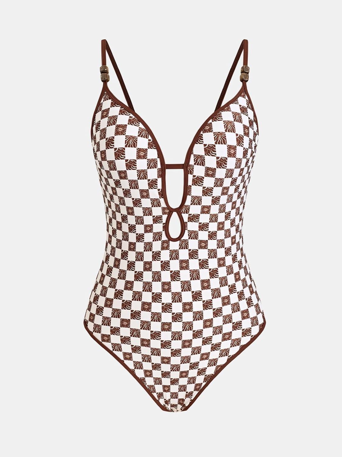 CUPSHE Women's One Piece Swimsuit Plunging V Neck Keyhole Bathing Suit Cutout Adjustable Straps Spaghetti Color Block(Brown/White Plaid)