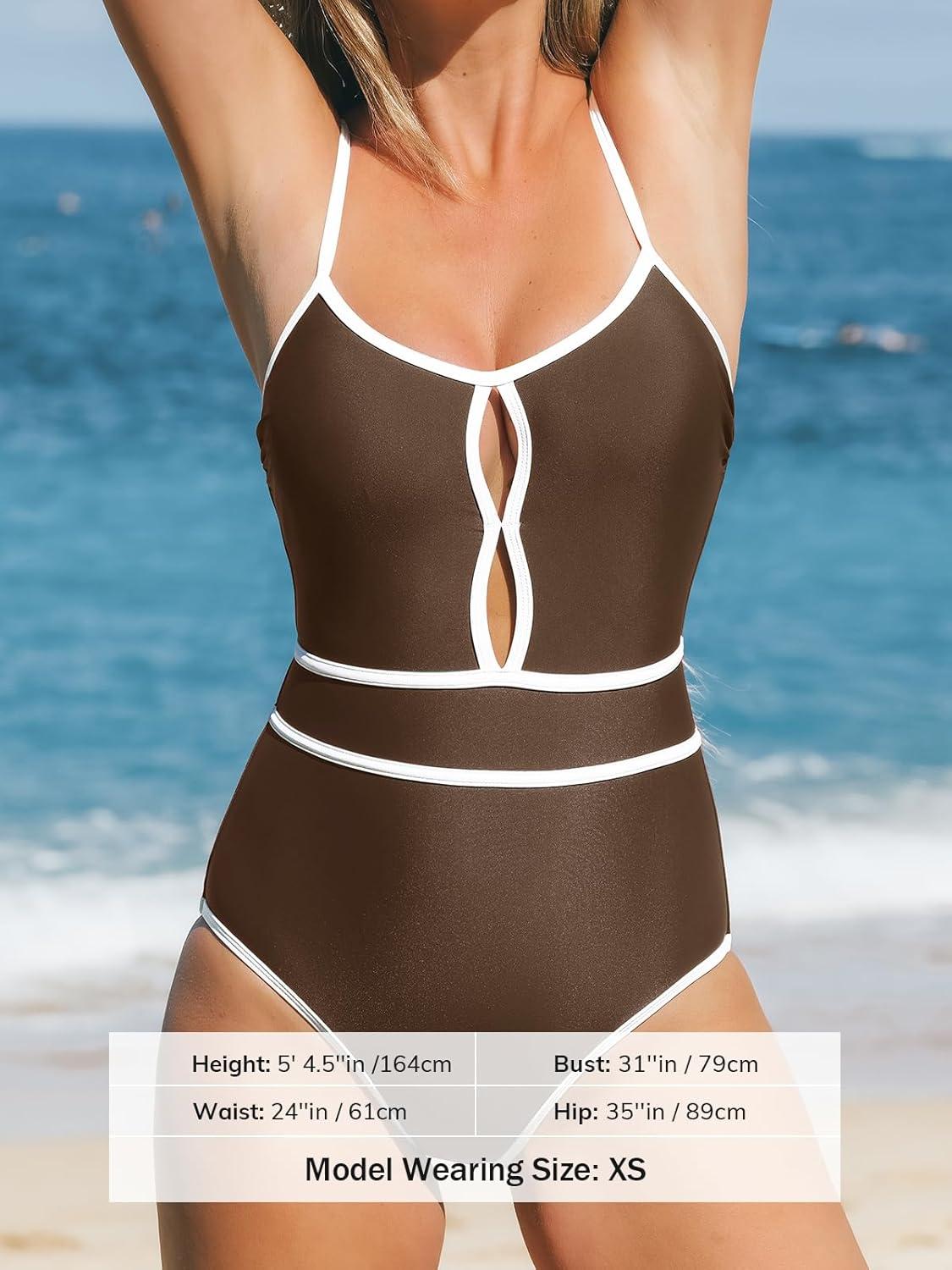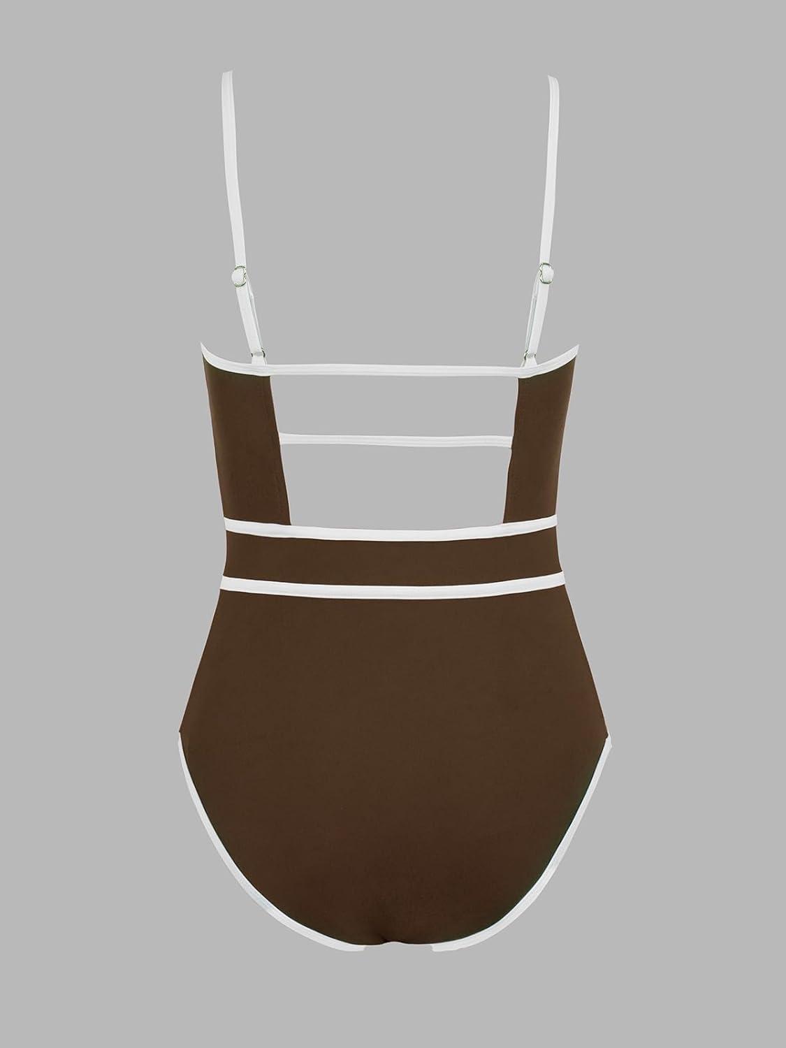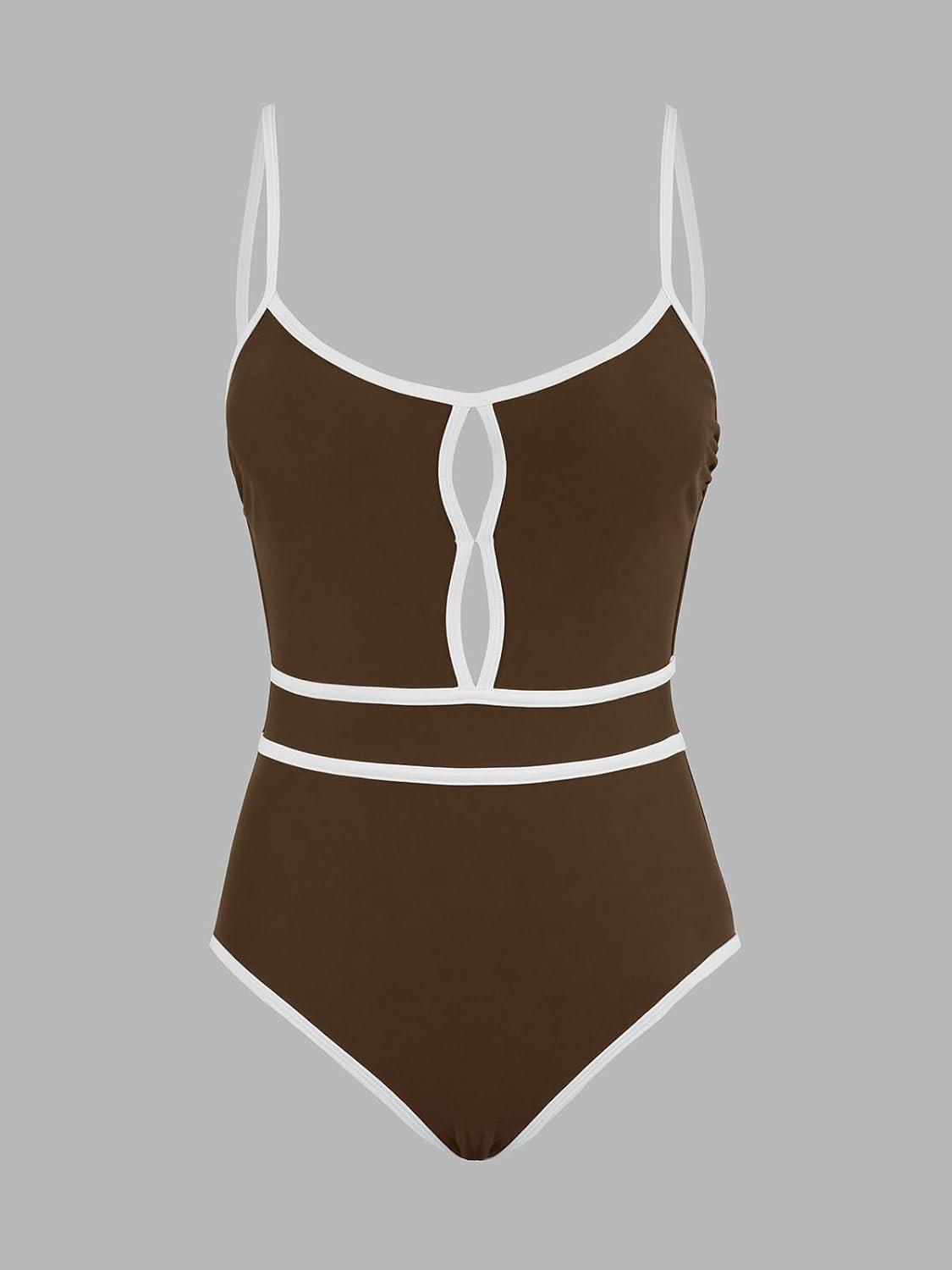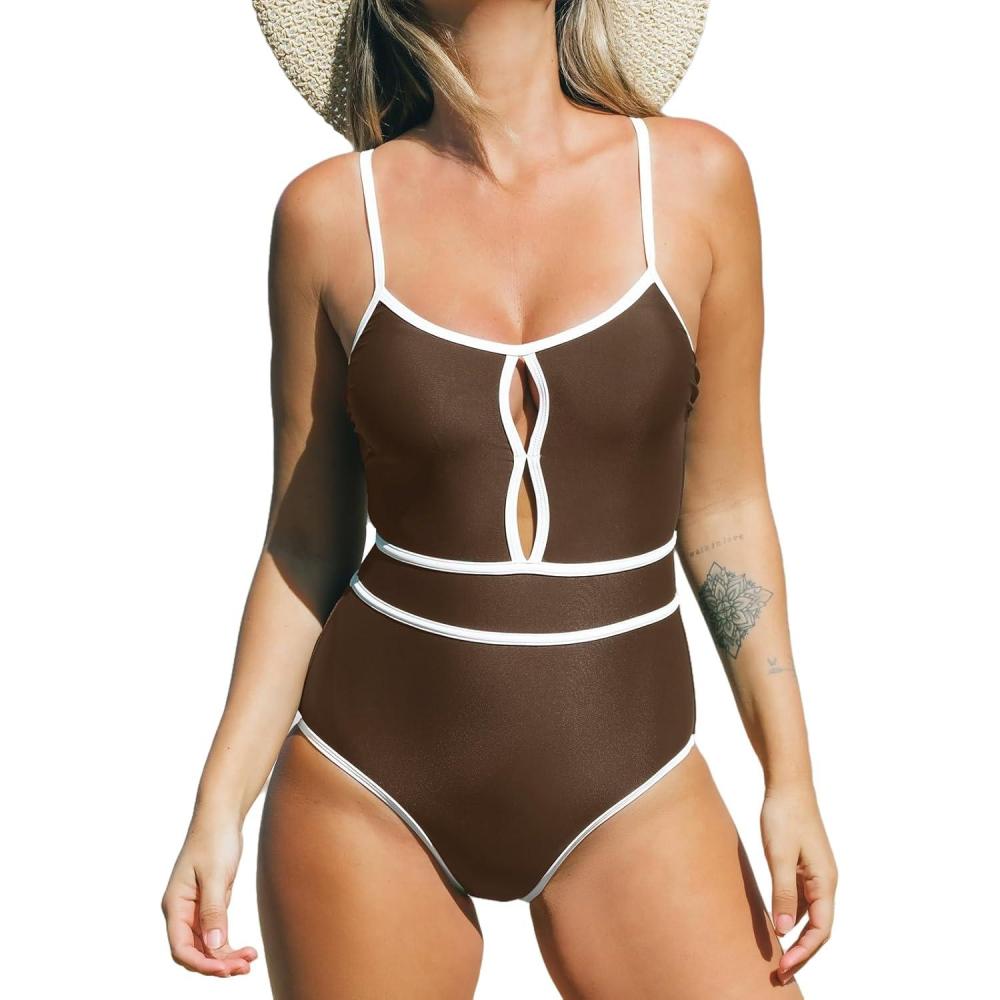 CUPSHE Women's One Piece Swimsuit Scoop Neck Bathing Suit Keyhole Cutout Color Block Adjustable Straps Swimwear(Brown/White)