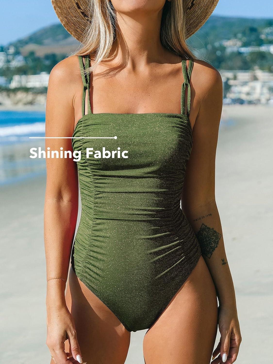 CUPSHE Women’s One Piece Swimsuit Tummy Control Square Neck Bathing Suit Ruched Adjustable Straps(Olive Green)