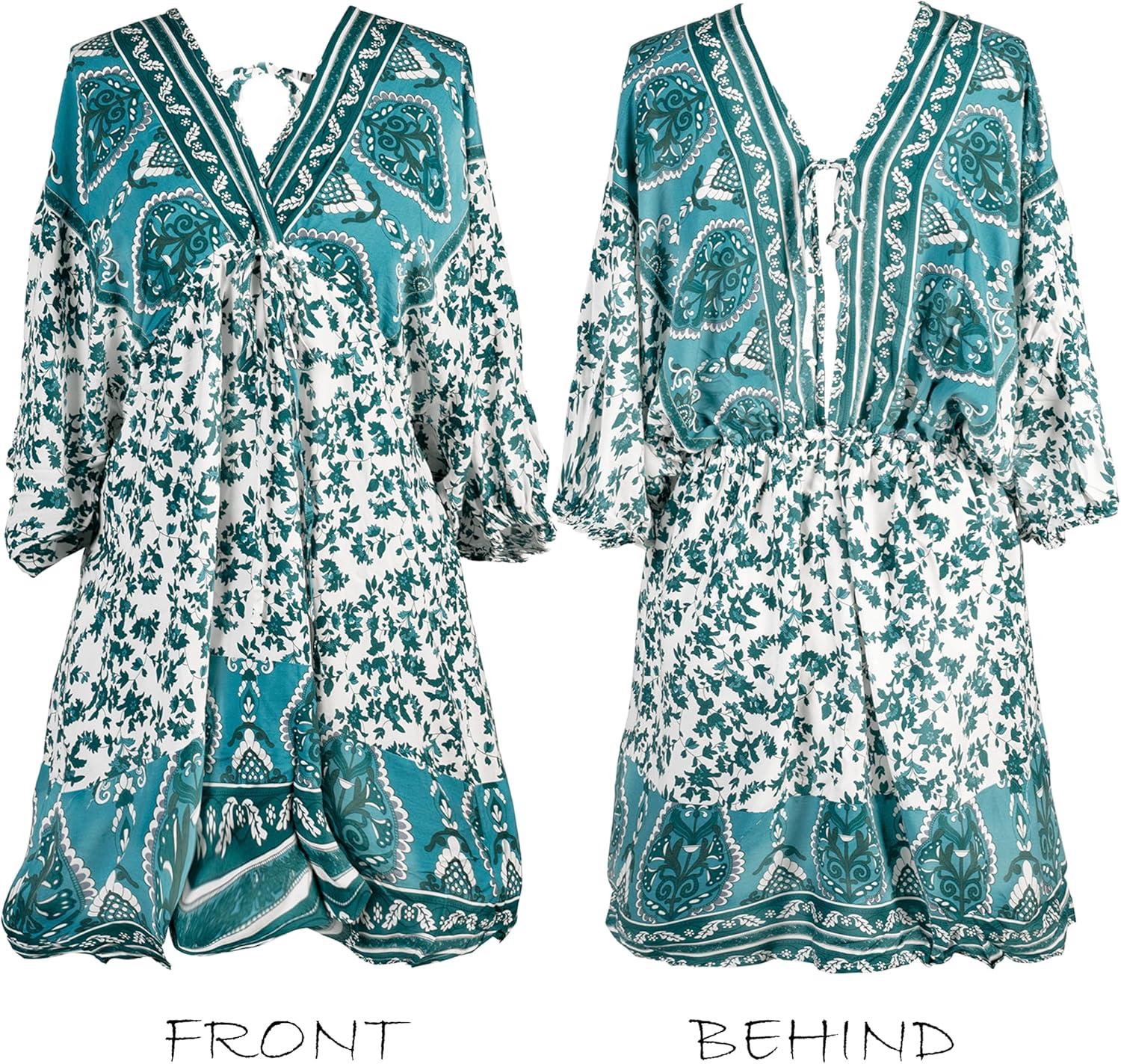 CUPSHE Women’s Plunging V Neck Backless Beach Dress Paisley Boho Blouson Sleeve Back Tie Waist Tie Mini Summer Dresses(Green Paisley)