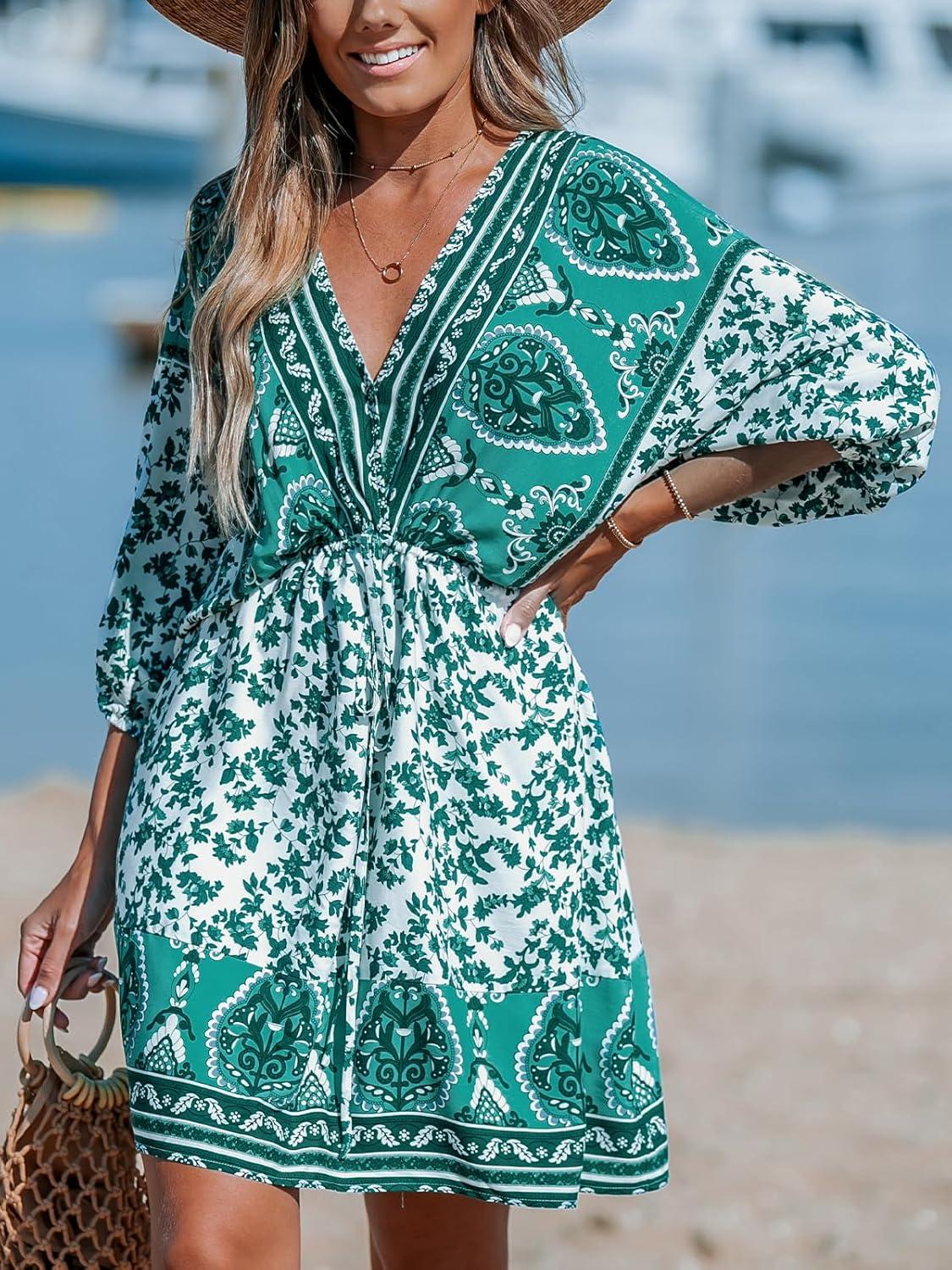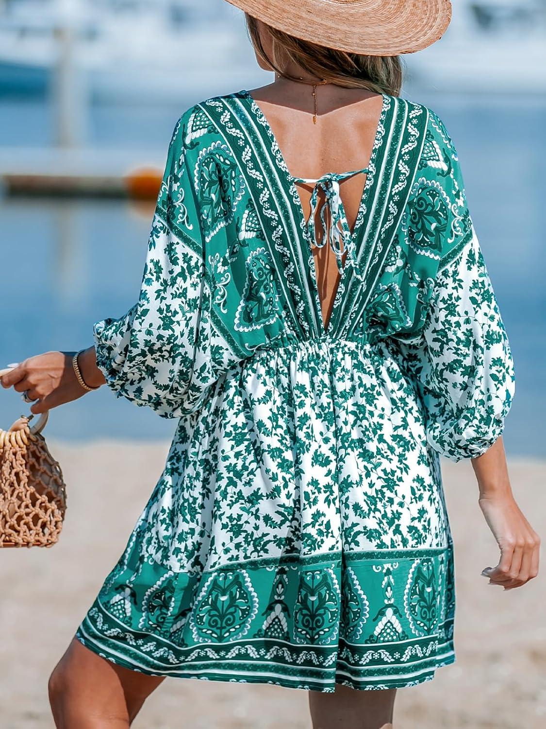 CUPSHE Women's Plunging V Neck Backless Beach Dress Paisley Boho Blouson Sleeve Back Tie Waist Tie Mini Summer Dresses(Green Paisley)